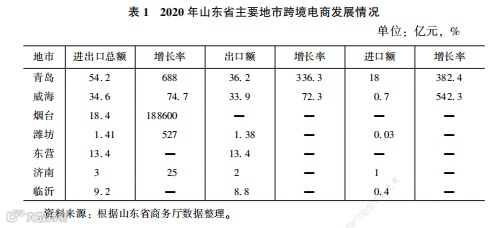 据山东省商务厅数据,2020年山东省跨境电商整体进出口138. 3 亿元,同比增长366. 2%,其中,网购保税进口22. 5亿元,同比增长484. 4%;跨境直购出口50. 4亿元,同比增长101. 6%;2021 年全省跨境电商进出口、市场采购贸易出口实现“双过千亿元”,为外贸增长注入新动能。因淄博与日照是新获批跨境电商综试区,故暂不统计其年数据。从各市情况看,如表 1 所示,青岛与威海一马当先,占据了山东省跨境电商进出口绝对的份额,但烟台、潍坊的增长态势很好。