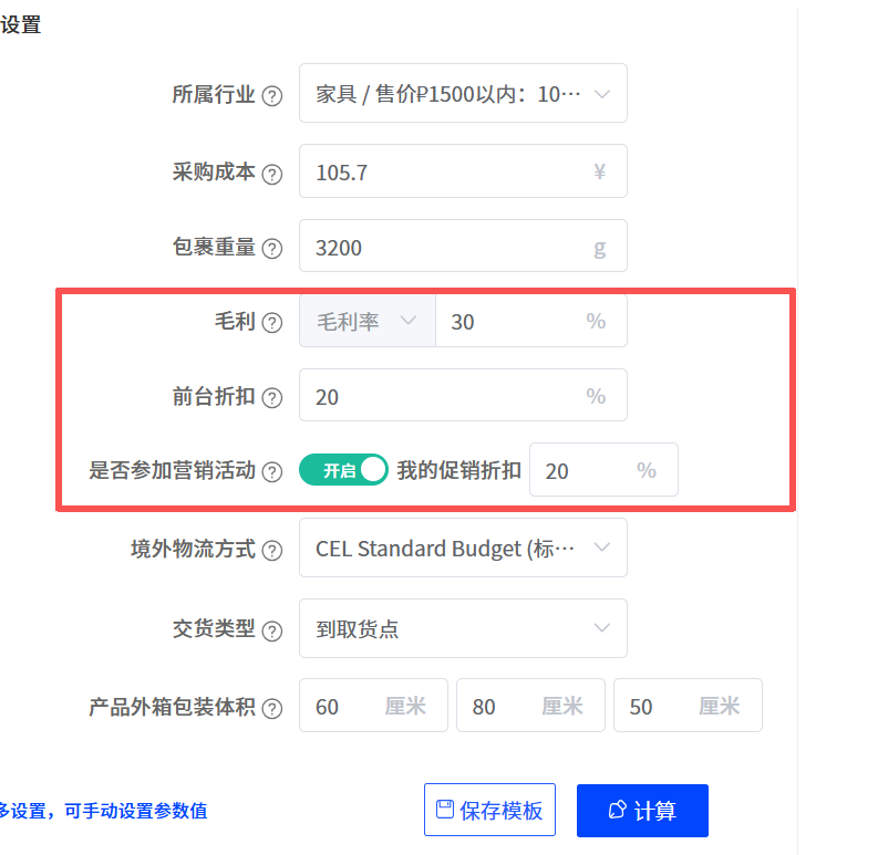 采购成本、贴单费、国际运费、佣金、提现和利润这些都是我们已经确定的,它们属于确定性的因素,我们在商品上架的时候就可以确定这些的具体的金额(通过定价工具进行计算)。