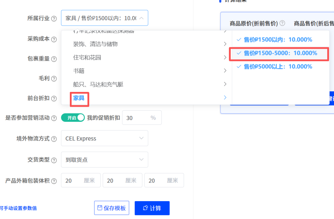 不同商品的类目,定价多少,所收取的佣金是不一样的,定价方面有<1500卢布;1500-5000卢布;大于5000卢布三个档位,有的类目不受价位的影响,这里我们选择家具类目,1500-5000卢布。
