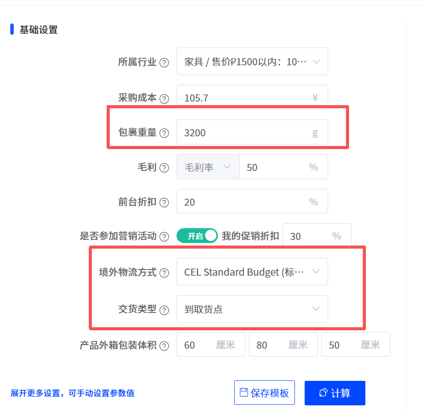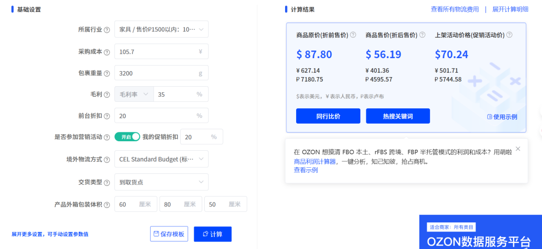 商品活动则是ozon官方参加的活动,具体有ozon强制参加的活动,以及你自愿参加的x2,x3,x4的限时活动,这个具体后面我会单独出一期内容,这里如果你参加了就填20%左右,毛利率30%,或者不参加,直接填毛利率50%