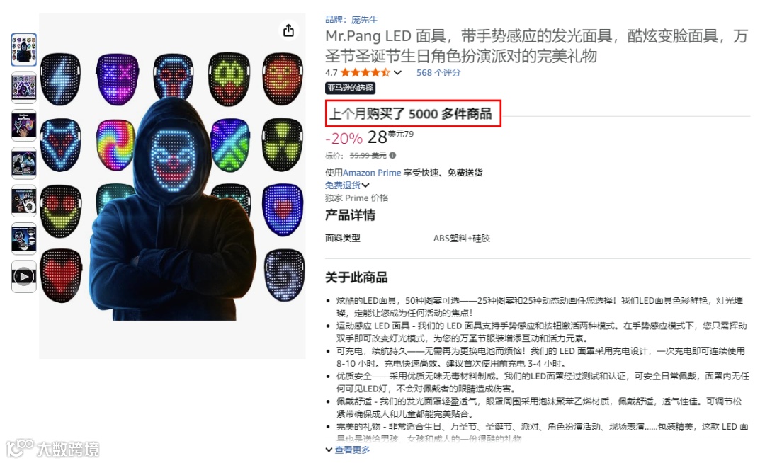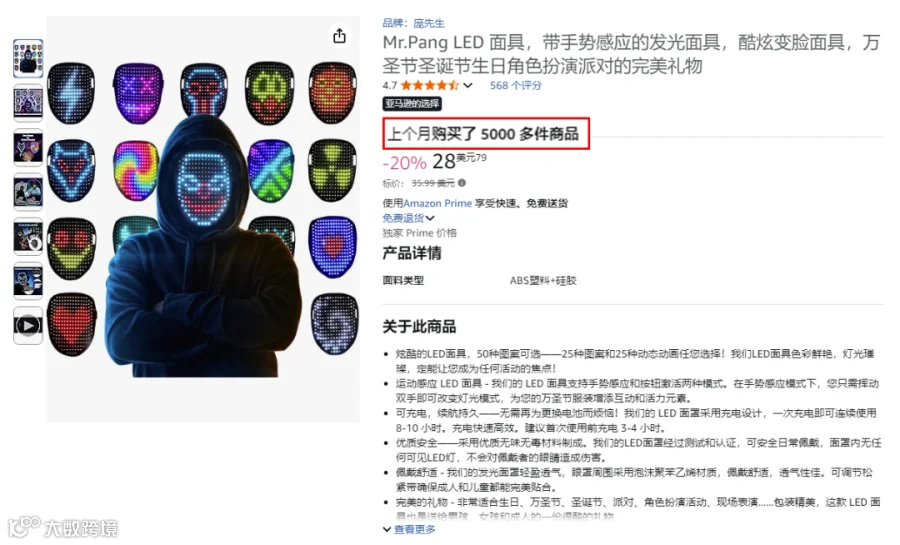 来自亚马逊名为Mr.Pang店铺的LED面具,售价28.79美元,已售出超5000件。