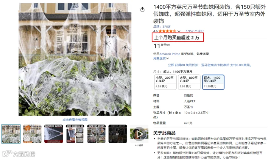 在非照明类目中,带有蜘蛛网的装饰产品最为火爆。这款由ZPISF推出的自带蜘蛛的弹性网状装饰品,以11.99美元的价格售出了2万件,位列园林热销榜TOP 2。