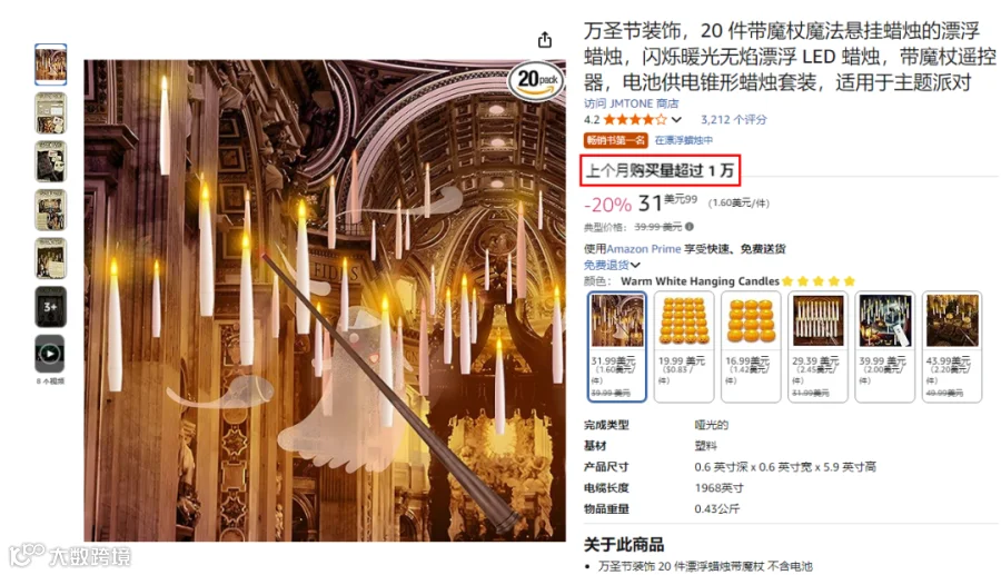 来自JMTONE的漂浮蜡烛,价格为31.99美元,本月销量已突破万件。不仅如此,该款产品在TikTok小店中也位列万圣节类目销量第一。
