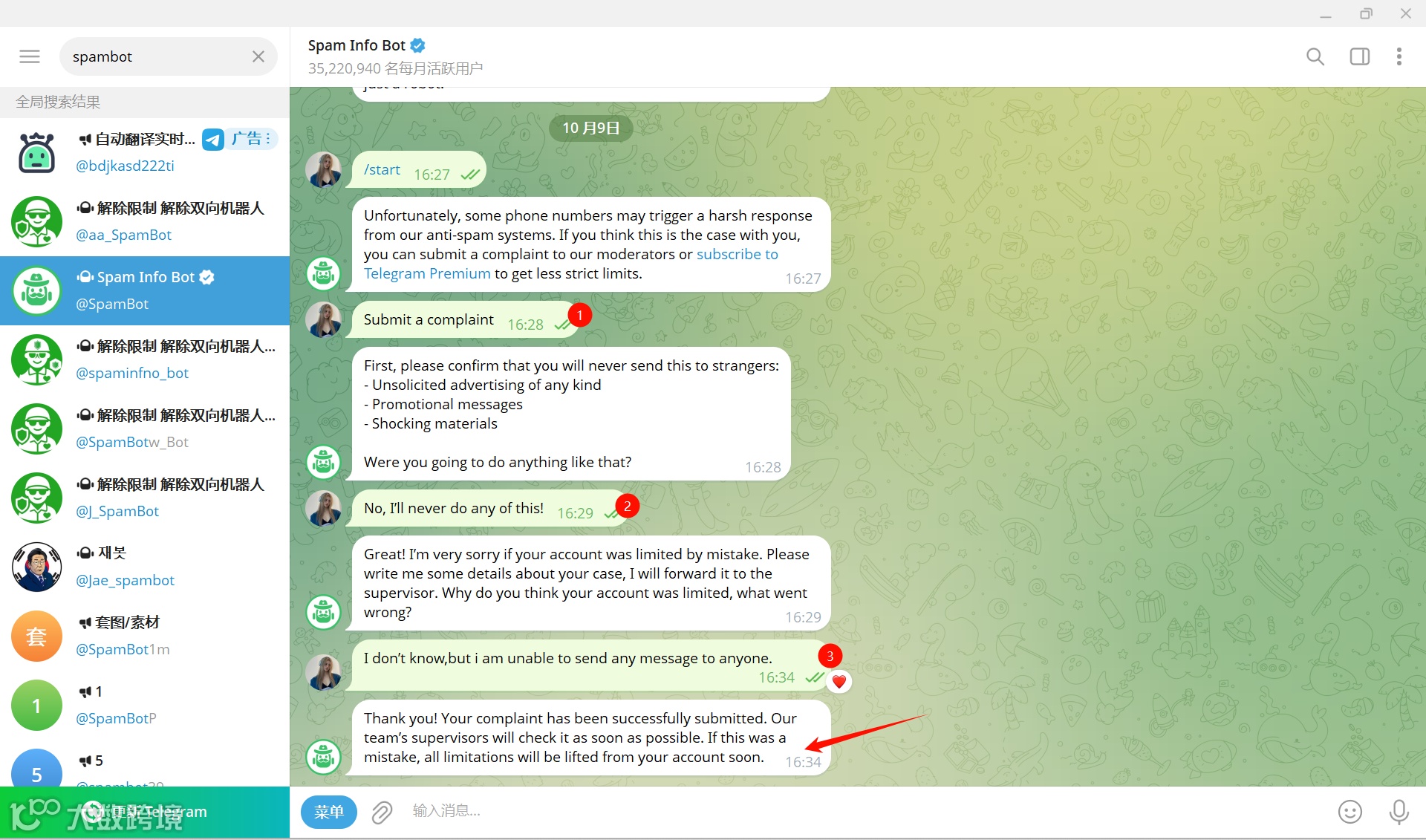 打开Telegram搜索官方的机器人@SpamBot,点击“开始”,根据机器人回复的信息来操作