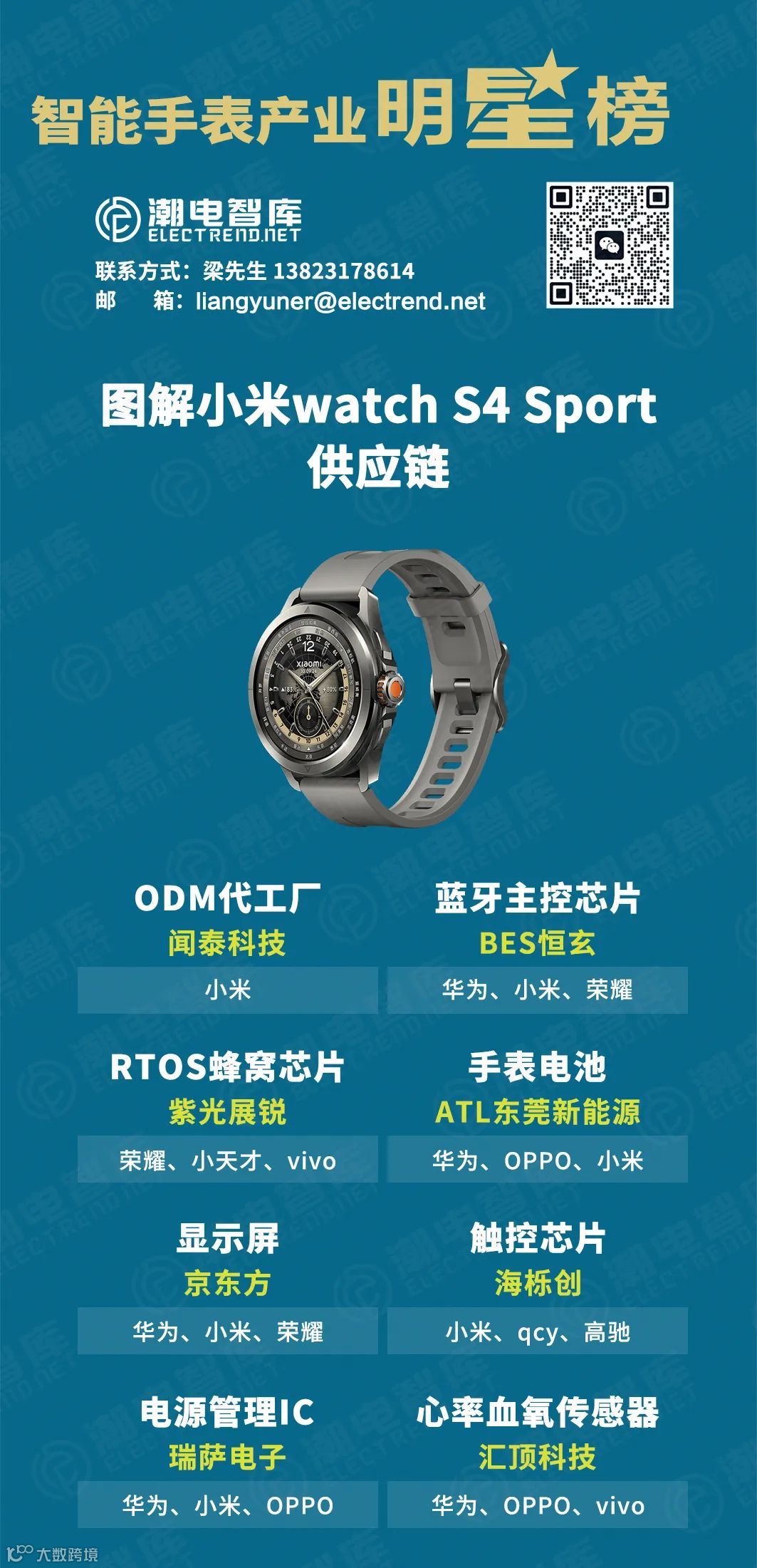 根据潮电智库从产业链了解到的信息,小米Watch S4 Sport由闻泰科技代工制造,搭载了BES恒玄科技的蓝牙芯片以及紫光展锐提供的ROTS蜂窝芯片;屏幕供应商为京东方,触控芯片及心率血氧传感器来自海栎创和汇顶科技;而ATL东莞新能源与瑞萨电子分别负责电池及相关电源管理方案。