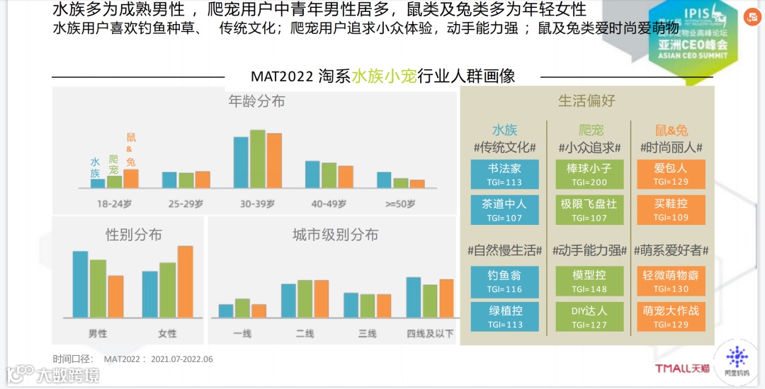 另据数据显示,饲养水族的多为成熟男性,爬宠用户中青年男性居多,鼠类及兔类多为年轻女性。水族用户喜欢钓鱼种草、传统文化;爬宠用户追求小众体验,动手能力强;鼠及兔类爱时尚爱萌物。