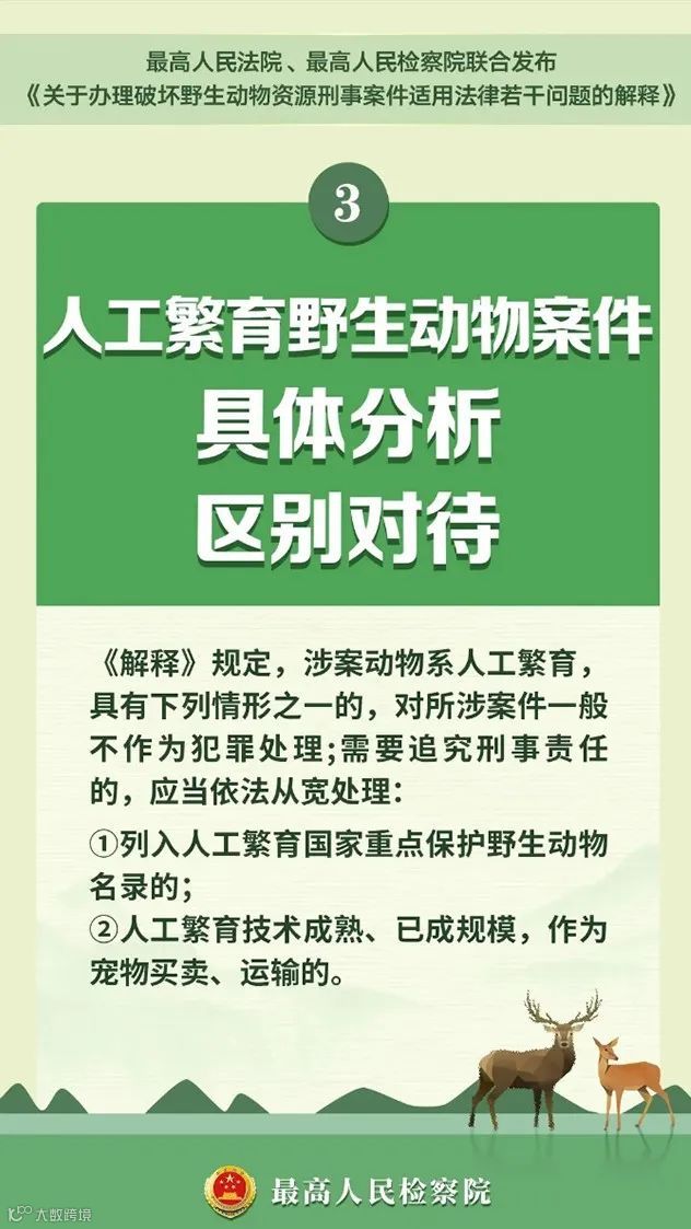 今年4月,“最高人民法院,最高人民检察院”联合发布了《关于办理破坏野生动物资源刑事案件适用法律若干问题的解释》。其中指出,在刑事追究上,不宜将涉人工繁育野生动物的案件与涉野外环境自然生长繁殖野生动物的案件同等对待。人工繁育技术成熟、已成规模,作为宠物买卖、运输的,对所涉案件一般不作为犯罪处理。