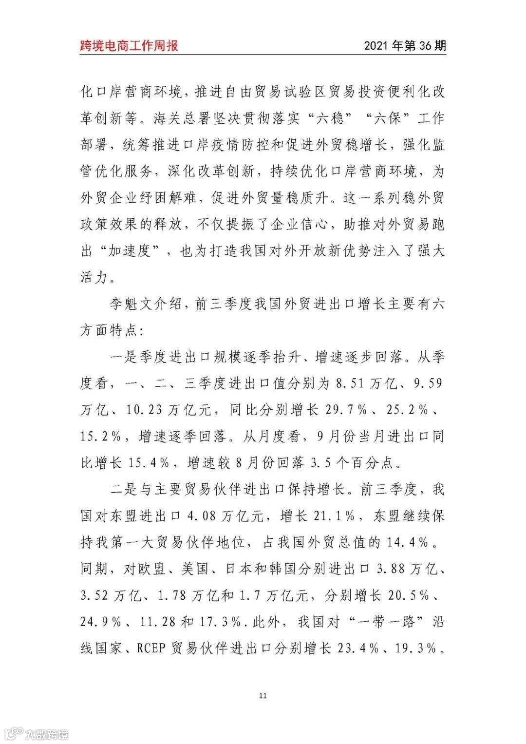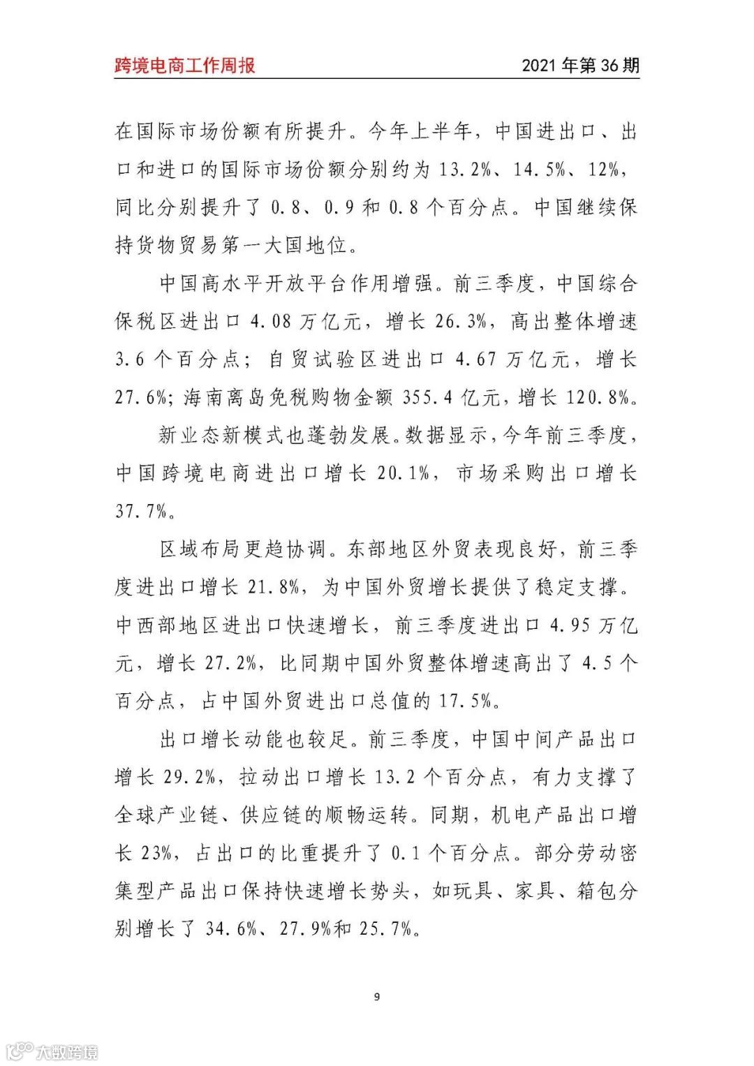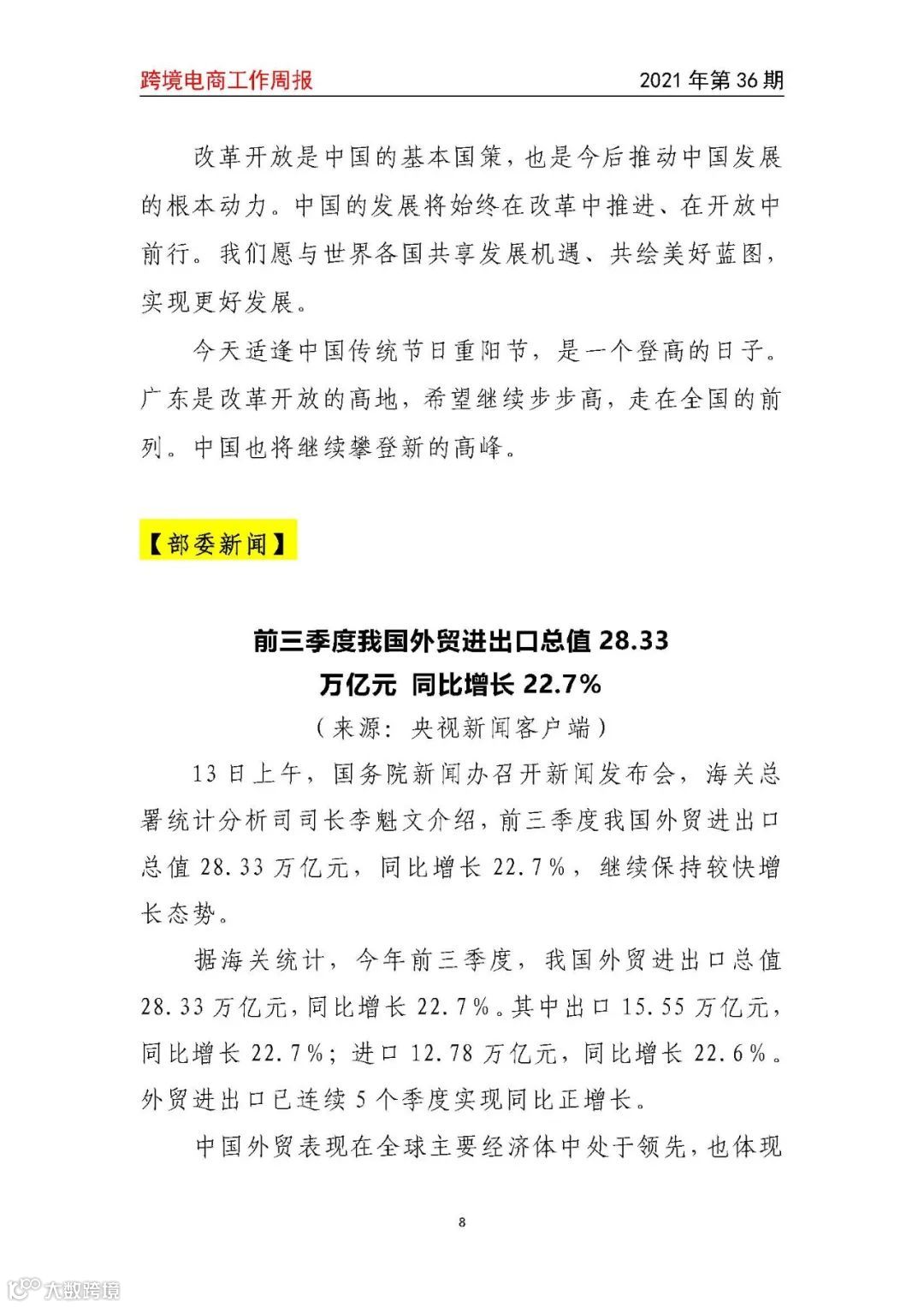 【跨境电商周报2021年第36期】前三季度我国外贸进出口总值28.33万亿元 同比增长22.7%