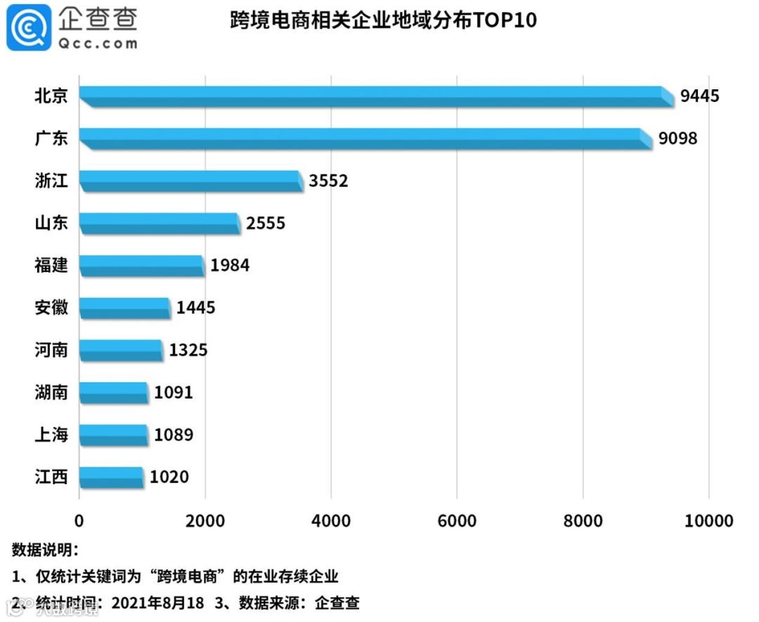 此外,跨境电商相关企业数量也大幅增长。据企查查数据显示,全国范围内共有2.9万余家“跨境电商”相关企业。2020年相关企业新注册6145家,同比增长58%。今年上半年共新增5367家,同比增长113%。从地区分布来看,北京、广东分别以9445家、9098家企业排名前两位,浙江、山东、福建分列3-5名。此外,共有65%的企业注册资本在500万以内。