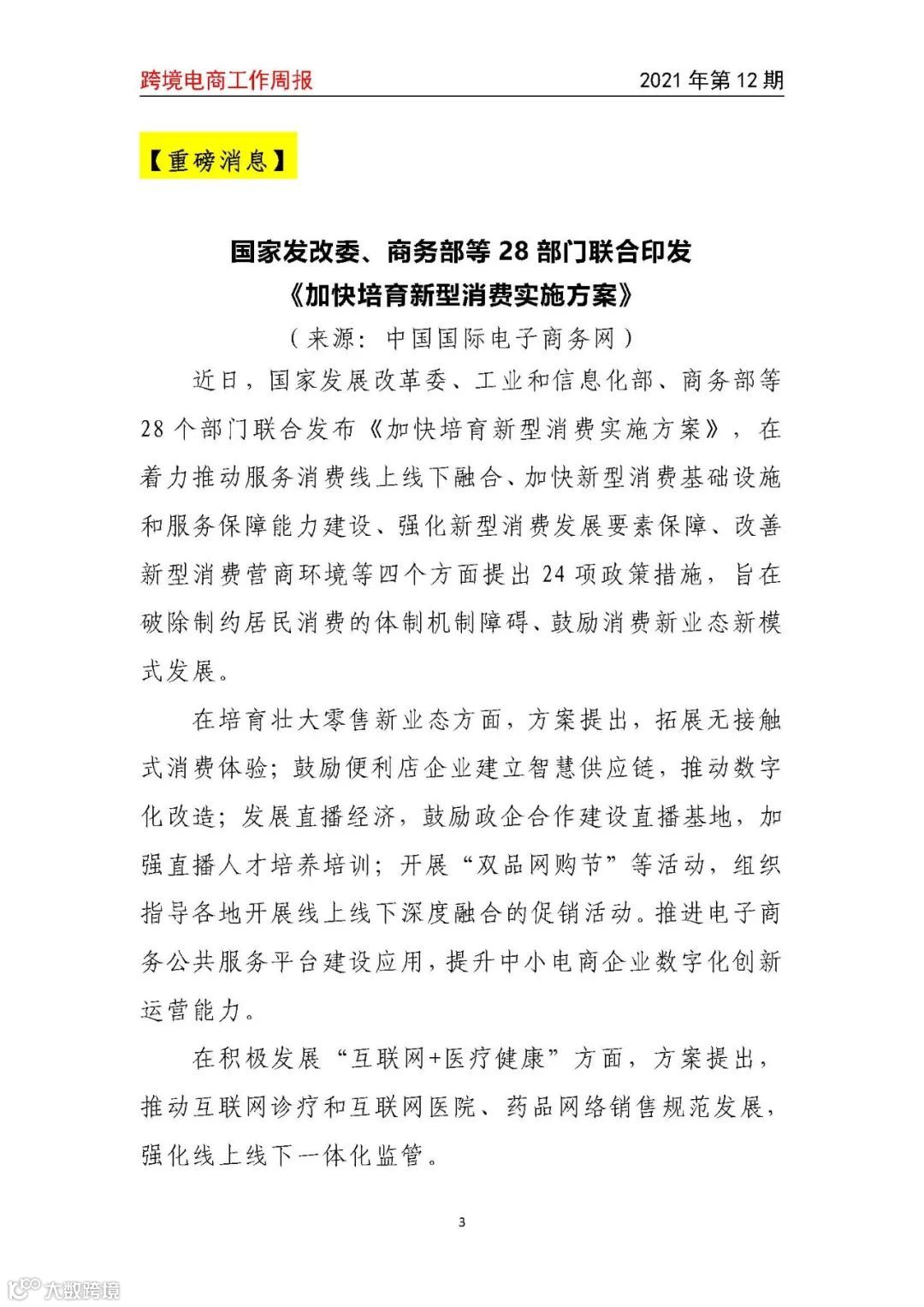 【跨境电商周报2021年第12期】国家发改委、商务部等28部门联合印发《加快培育新型消费实施方案》