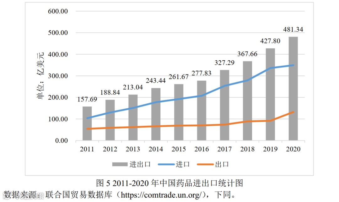 近年来,国内市场的进口药品需求旺盛,我国药品进出口贸易持续增长,总体呈现以进口为主、贸易逆差不断扩大的格局。如图5所示,2011-2020年我国药品年均进出口额为294.66亿美元,年均增长率为13.20%,整体呈现快速增长态势,特别是2017-2020年阶段,增长速度加快,连续突破300、400亿美元。