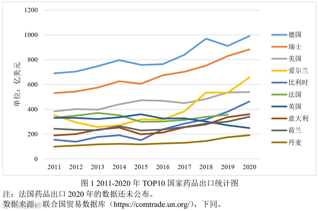 2019年全球药品出口市场规模约为6千亿美元²,比2011年约增长了38%,药品出口额排在全球前十位的国家分别为德国、瑞士、美国、爱尔兰、比利时、法国、英国、意大利、荷兰、丹麦,其出口总额约占全球出口额的76.91%。根据图1(2011-2020年TOP10国家药品出口统计图)和图2(全球各国药品平均出口分布图)所示,全球药品出口市场以欧洲国家为主导,可见欧洲医疗水平普遍偏高,医疗资源丰富,医疗科技处于世界前沿。