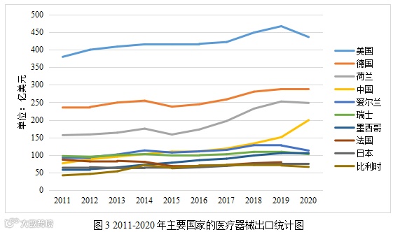 2019年全球医疗器械出口规模约为2312亿美元,比2011年增长37%,医疗器械出口额排在全球前十位的国家分别为美国、德国、荷兰、中国、爱尔兰、瑞士、墨西哥、法国、日本、比利时,其医疗器械出口总额约占全球出口额的74.59%。