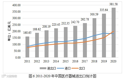 在医疗器械进口方面,2011-2019年我国医疗器械进口处于增长阶段,2020年受新冠肺炎疫情影响,全球医疗器械产业链供应链重组,各国优先满足本国需求,导致国际市场医疗器械资源的供给不足,出现下降趋势,增长率为-0.01%。