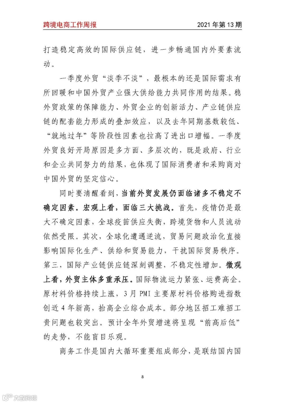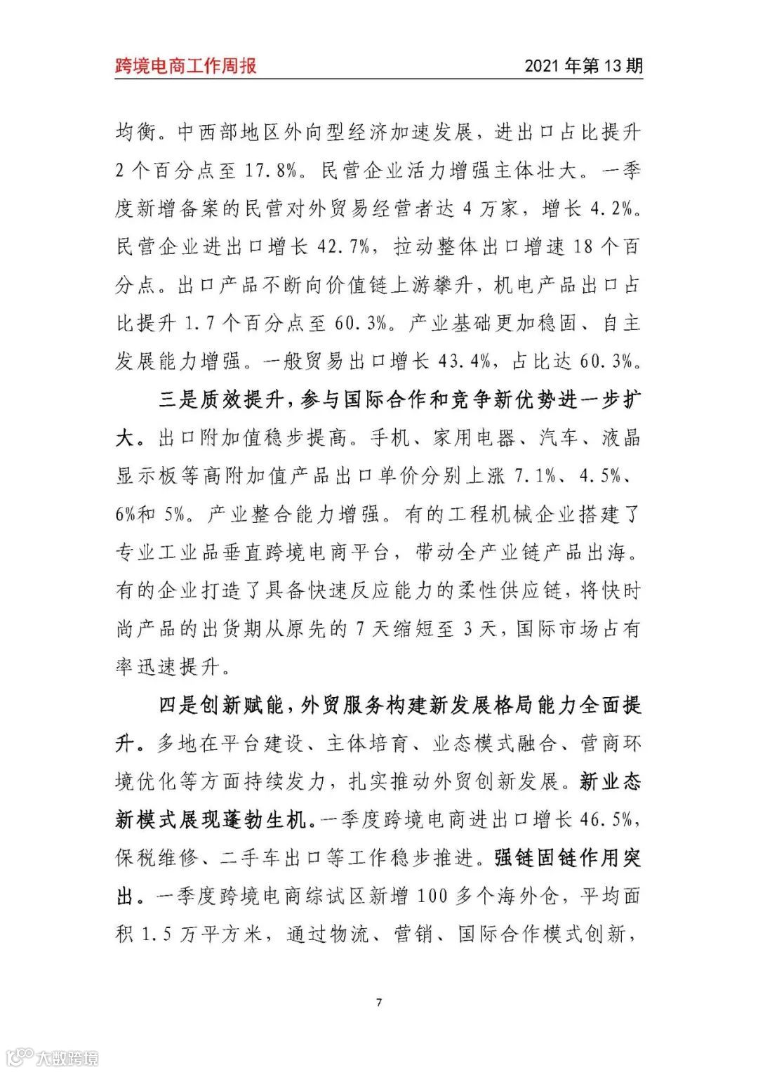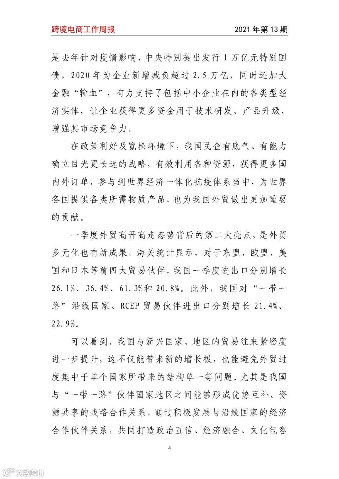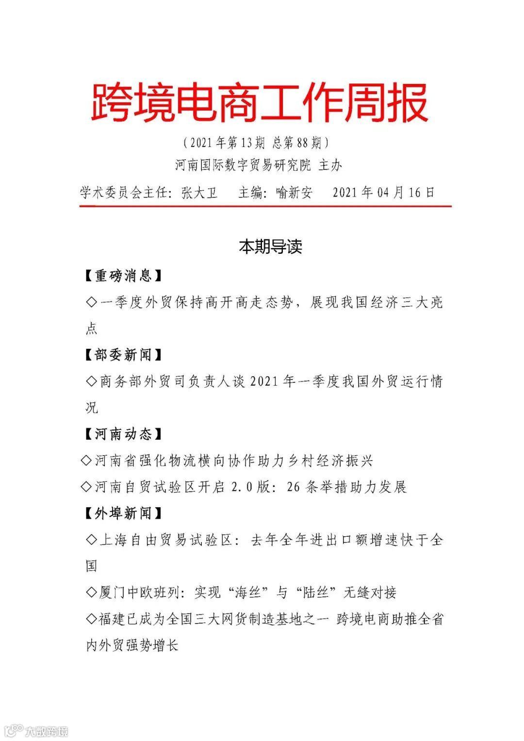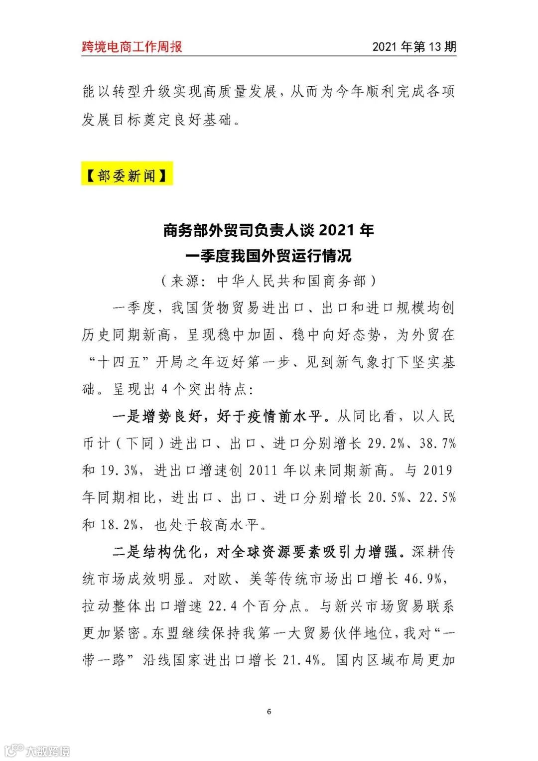 导读:【跨境电商周报2021年第13期】一季度外贸保持高开高走态势,展现我国经济三大亮点