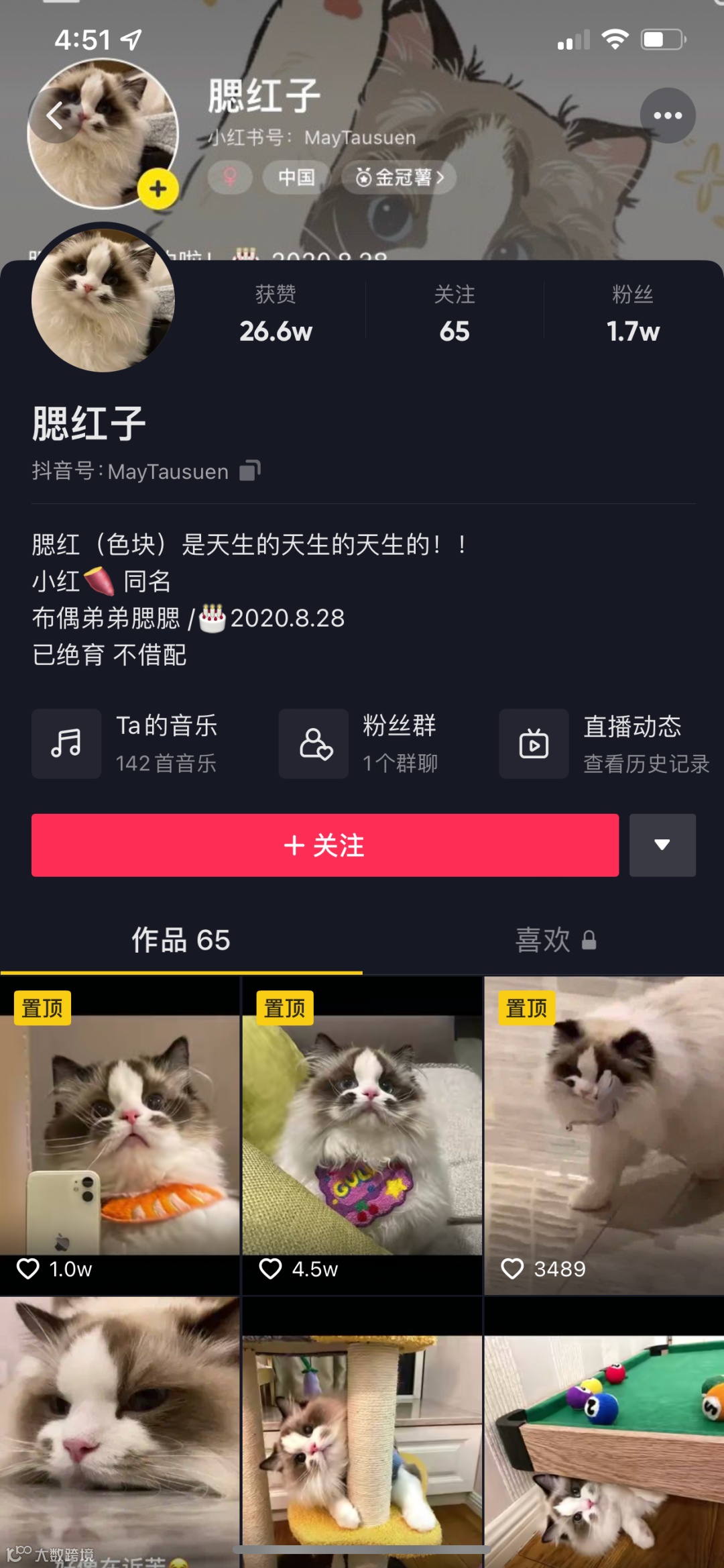 简介:猫百万自2021年4月1日在抖音上发布了自己的第一个作品,大致内容以探访全国猫舍的采访视频为主,其中,获赞数最高的视频作品为《libby布偶猫猫舍概况》,达到了159.9w赞。而目前猫百万的整体获赞数达到了580.5w,粉丝数达到了83.2w。