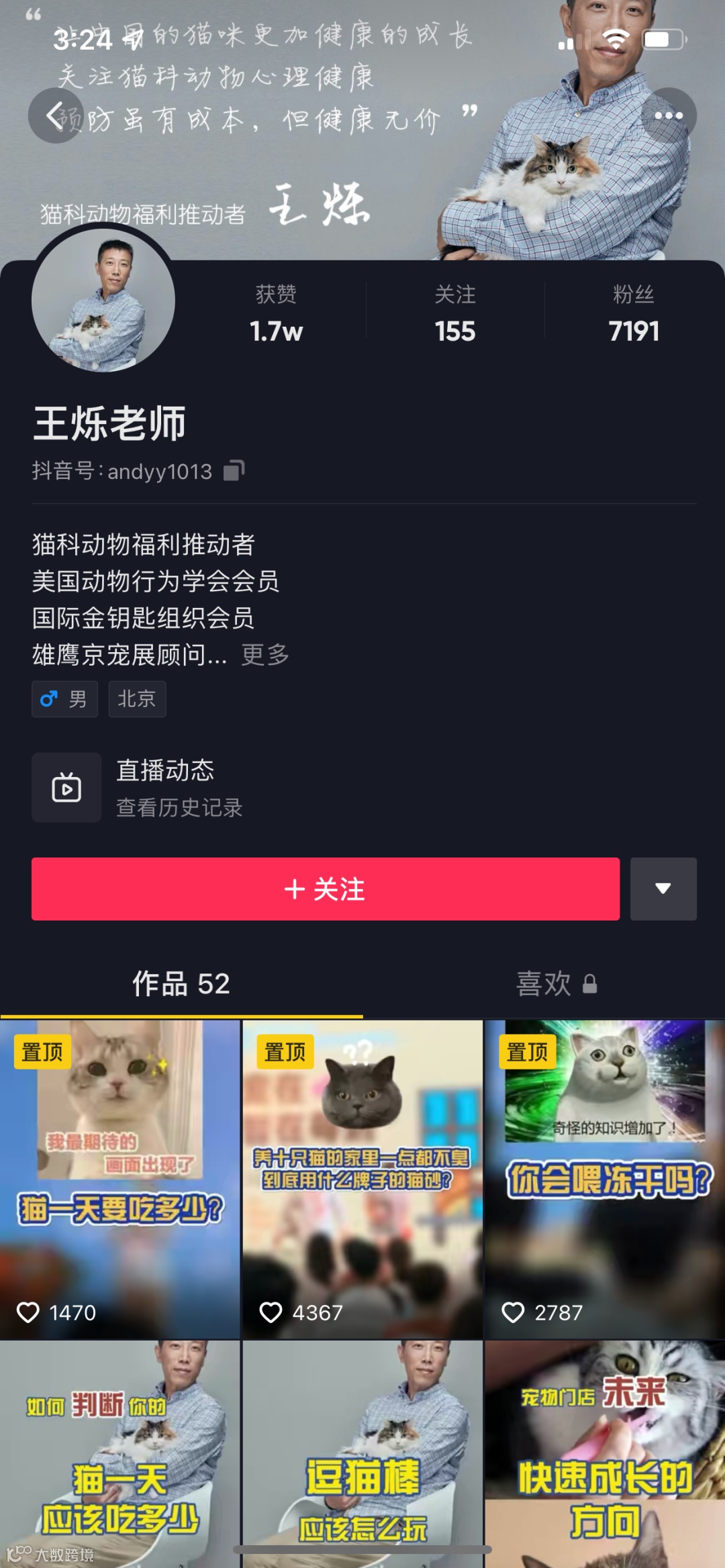 简介:王烁老师自2020年7月9日正式入驻抖音,王烁老师的作品大致内容以猫咪行为学为主,其中,获赞数最高的视频作品为《养十只猫的家里一点都不臭到底用什么牌子的猫砂》,达到了4367赞。而目前王烁老师的整体获赞数达到了1.7w,粉丝数达到了7191。