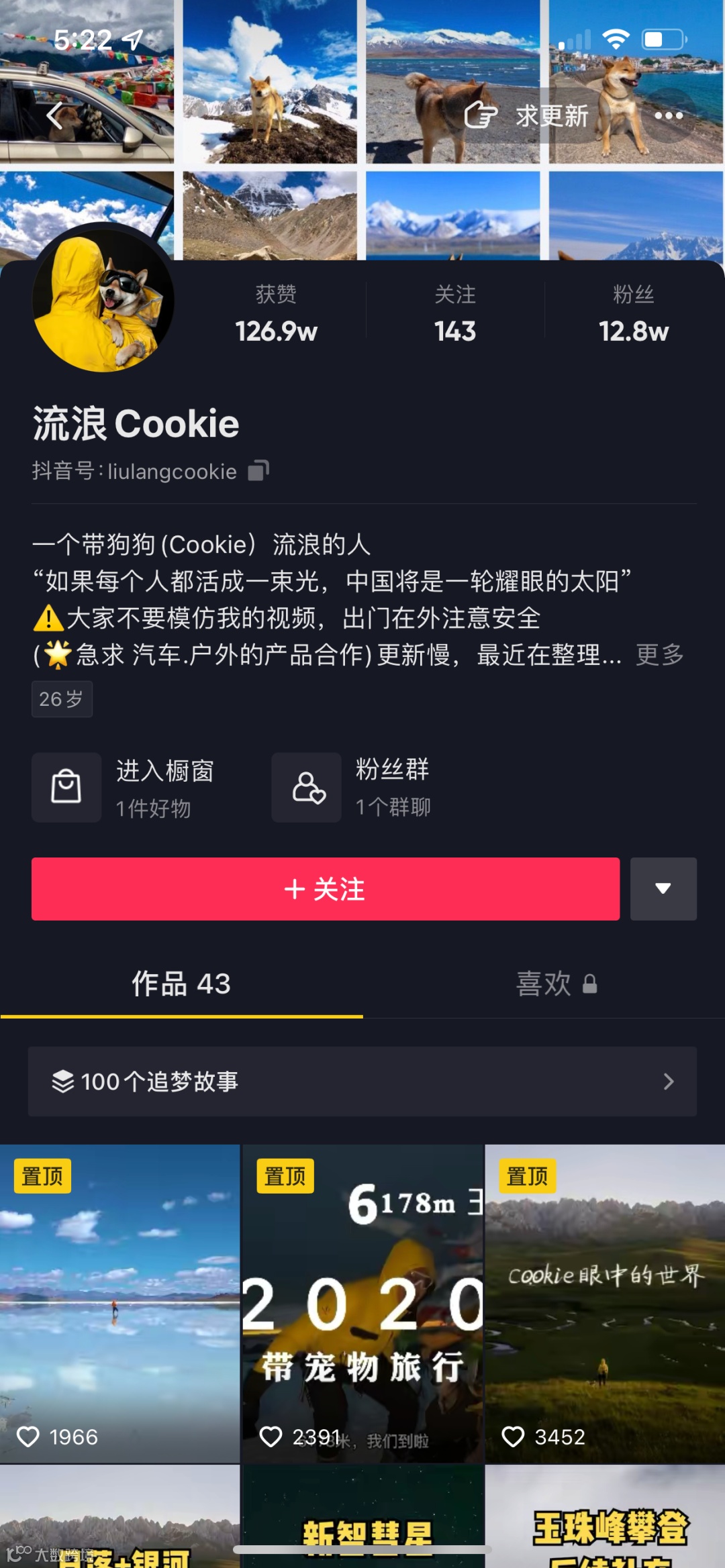 简介:流浪Cookie自2021年1月21日在抖音上发布了自己的第一个作品,大致内容以带Cookie旅行的vlog为主,其中,获赞数最高的视频作品达到了49.7w赞。而目前流浪Cookie的整体获赞数更是达到了126.9w,粉丝数达到了12.8w。