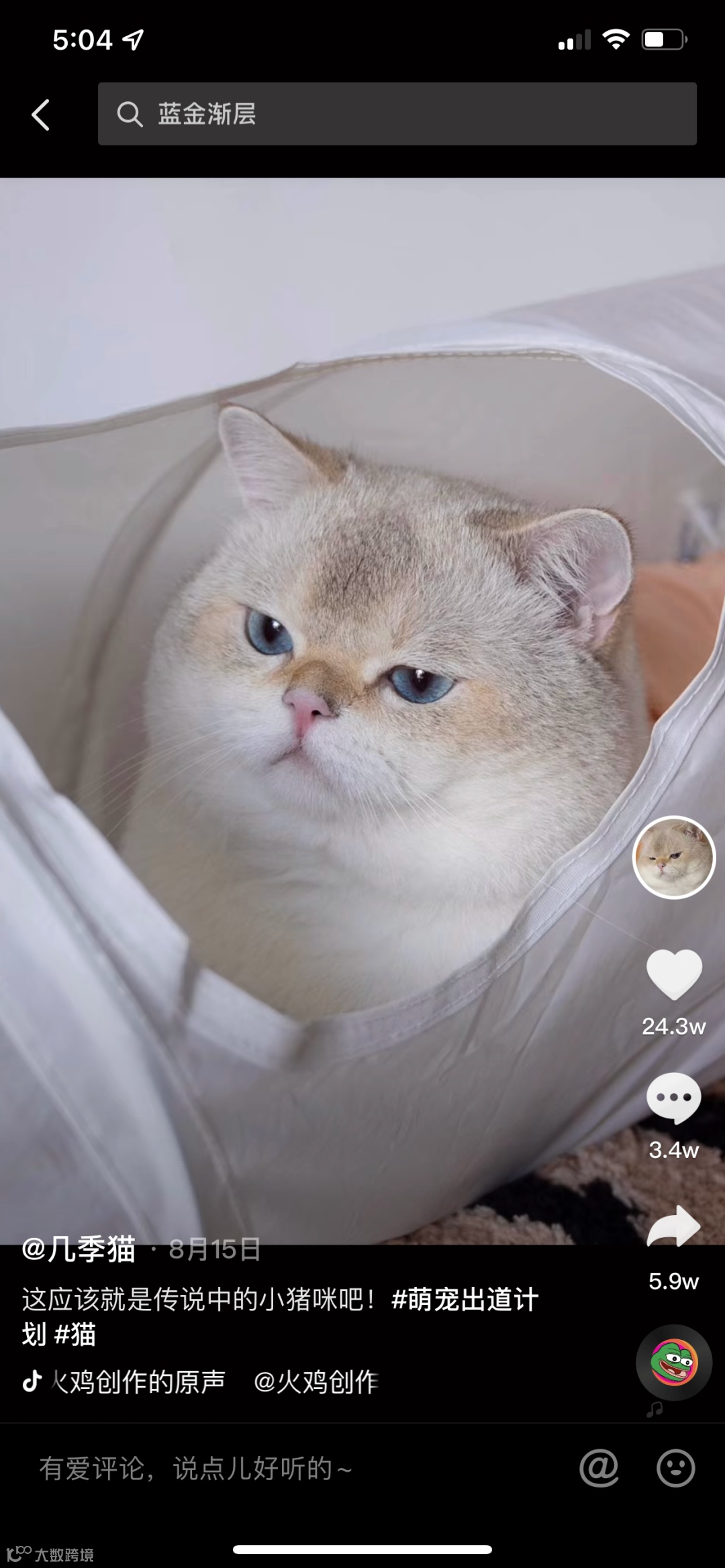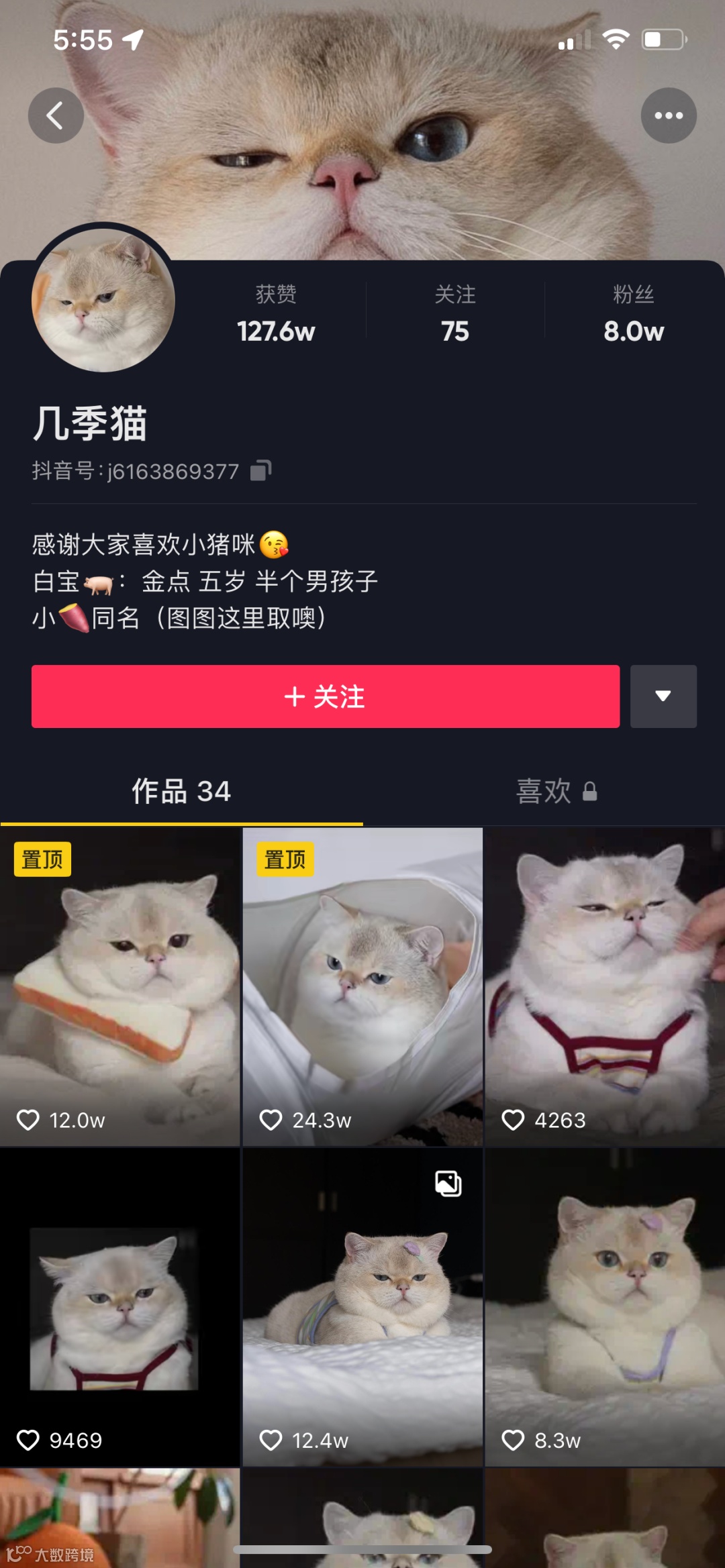 简介:几季猫自2021年6月13日在抖音上发布了自己的第一个作品,大致内容以小猪咪白宝的日常vlog和照片为主,其中,获赞数最高的视频作品为《这应该就是传说中的小猪咪吧!》,达到了24.3w赞。而目几季猫的整体获赞数达到了127.4w,粉丝数达到了8.0w。