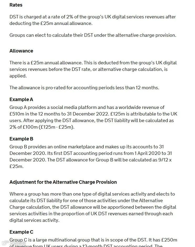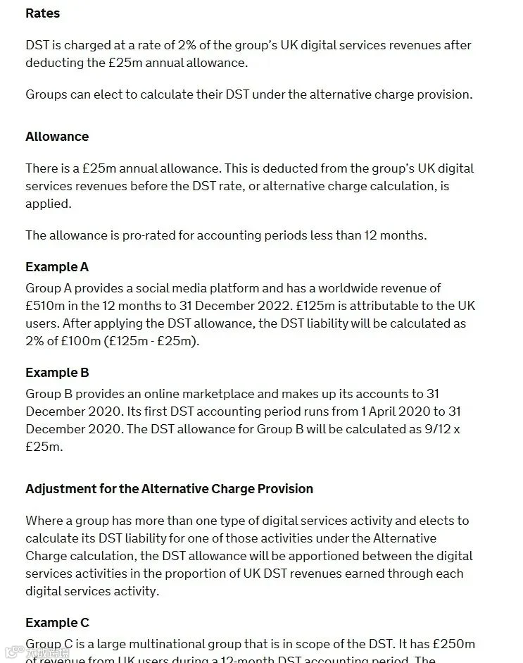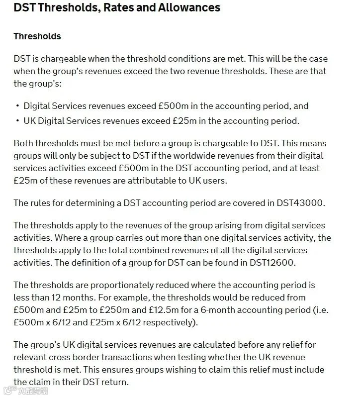税收制度及计算。根据英国税务和海关总署(HMRC)关于数字服务税的内部手册中显示(见下图),当企业满足在连续12个月内的会计期间,数字服务的全球收入超过5亿英镑,且至少有2500万英镑的数字服务收入属于英国境内用户时,需要缴纳DST。数字服务收入包括且不限于一项,适用于该企业内部所有数字服务活动,触发税收的阈值同时也适用于所有数字服务活动的合并收入。当会计期间少于连续12个月时,可按比例降低。例如,当6个月的会计期间时,5亿英镑的全球数字服务收入阈值按比例降低为2.5亿英镑,同时,英国境内数字服务收入阈值从2500万英镑按比例降为1250万英镑。另外,企业每年有2500万英镑的免征额,企业在英国境内数字服务收入在扣除2500万英镑免征额之后按照2%的税率缴纳DST,不足12个月的会计期间的免征额也按比例扣除;或不止一项数字服务活动时,可根据各项不同数字服务收入占企业总数字服务收入的比例抵减。而2020年7月11日,英国财政部又公布了新一轮的DST征求意见稿。