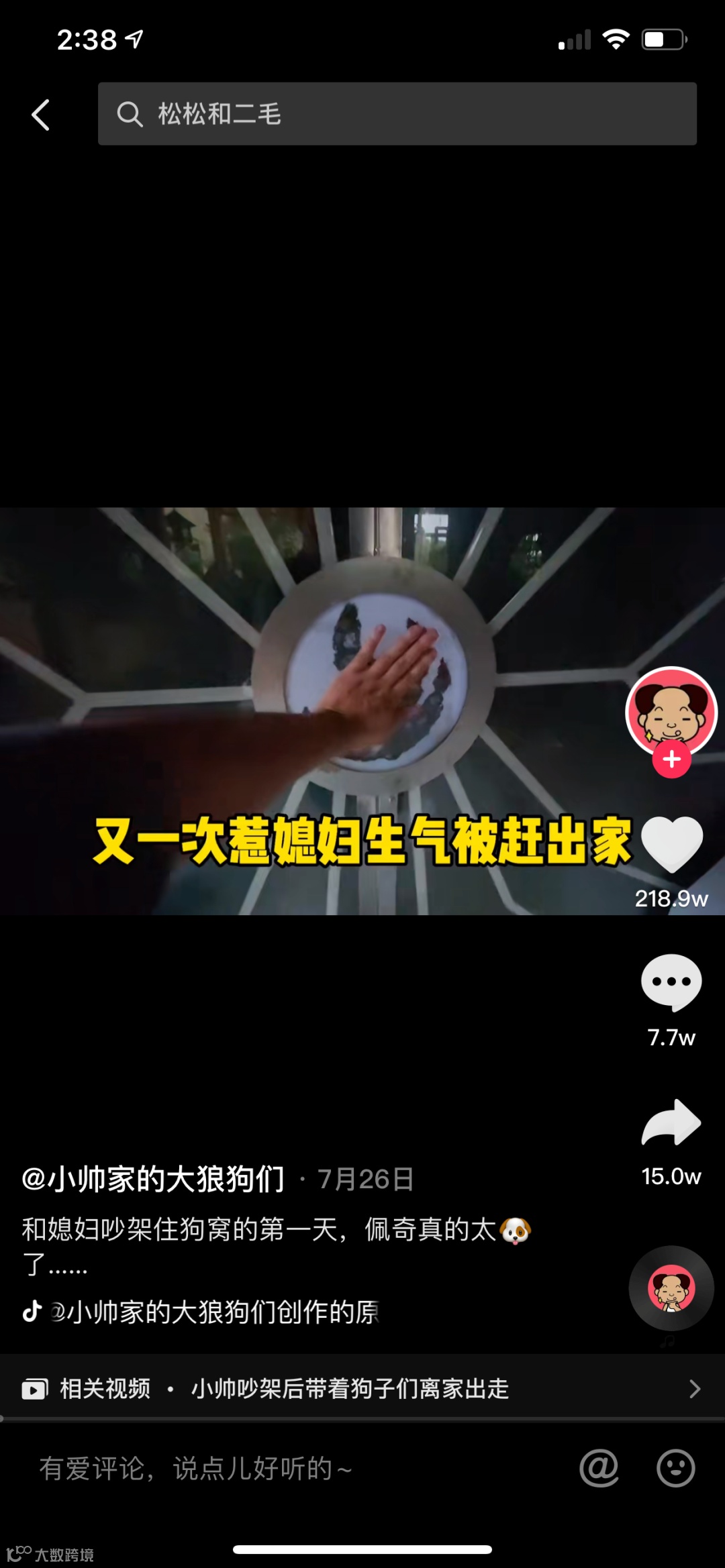 2、2019年7月9日,小帅家的大狼狗们发布视频合集《狗窝的升级之路》,目前已更新56集,播放量达到了4.2亿;