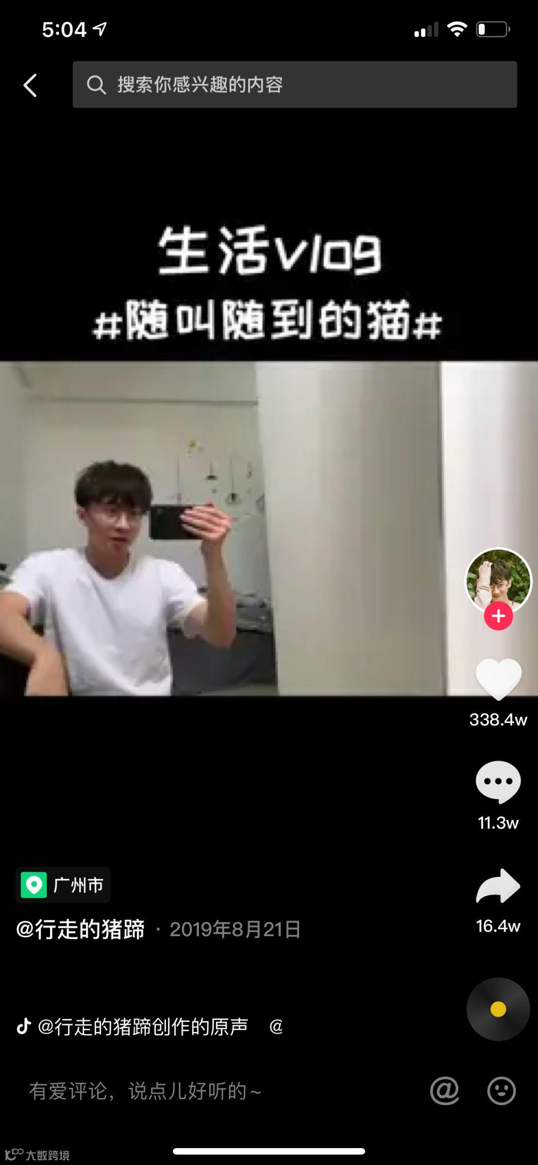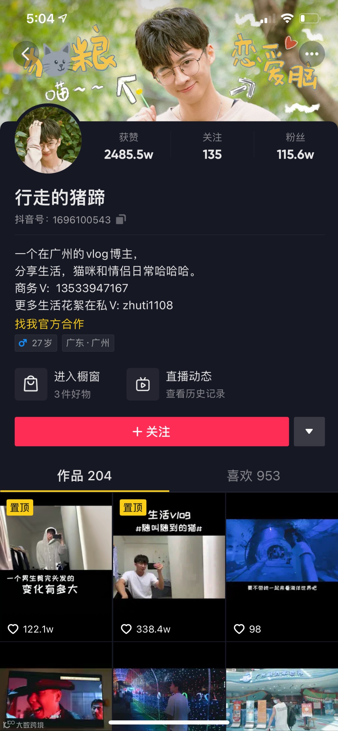 简介:行走的猪蹄自2019年1月16日在抖音上发布了自己的第一个作品,大致内容以猫咪和情侣日常vlog为主,其中,获赞数最高的视频作品为《随叫随到的猫》,达到了338.4w赞。而目前行走的猪蹄的整体获赞数达到了2485.5w,粉丝数达到了115.6w。