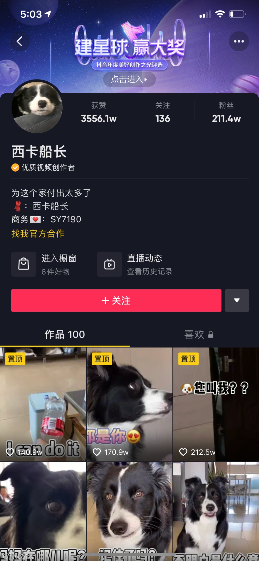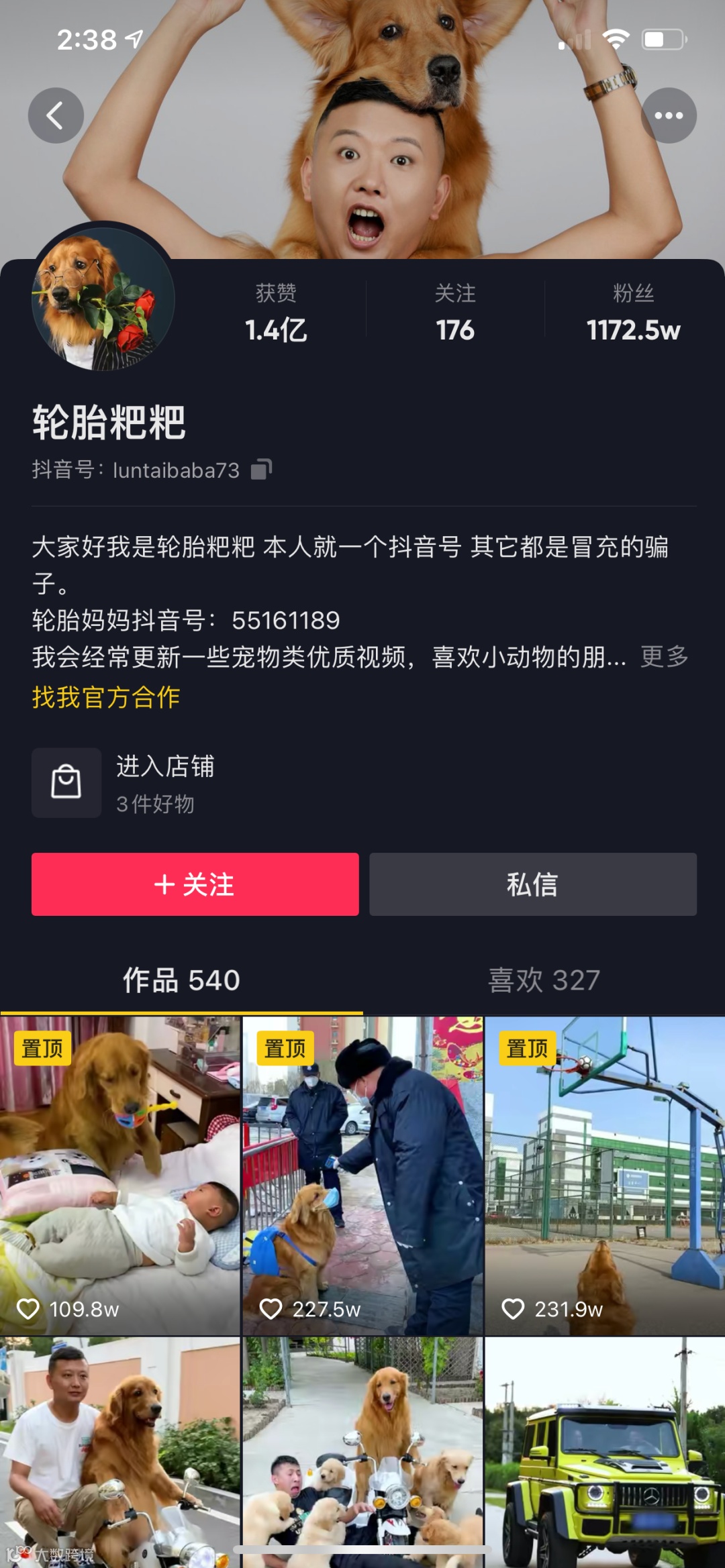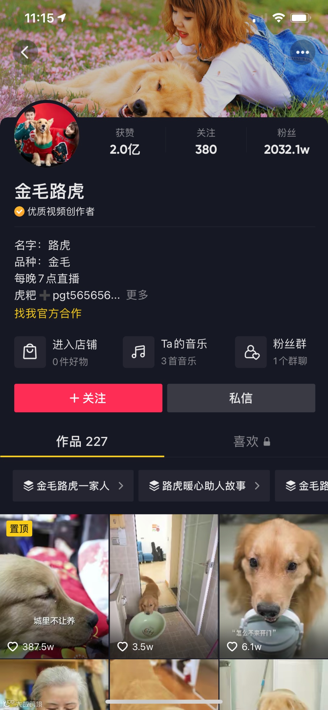 3、2021年3月17日,金毛路虎发布视频合集《金毛路虎一家人》,目前已更新82集,播放量达到23.0亿;