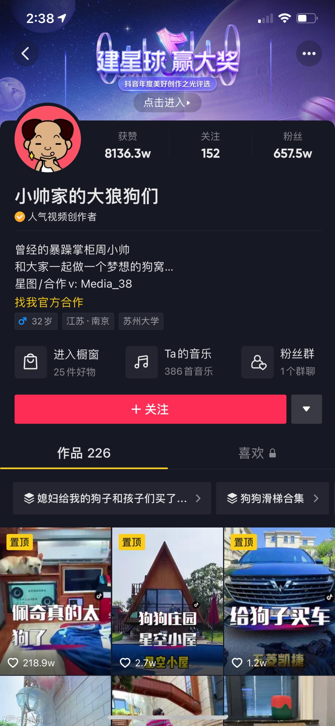 简介:小帅家的大狼狗们自2019年6月13日在抖音上发布了自己的第一个作品,大致内容以建造狗窝vlog为主,其中,获赞数最高的视频作品为《佩奇真的太狗了》,达到了218.9w赞。而目小帅家的大狼狗们的整体获赞数达到了8136.3w,粉丝数达到了657.5w。