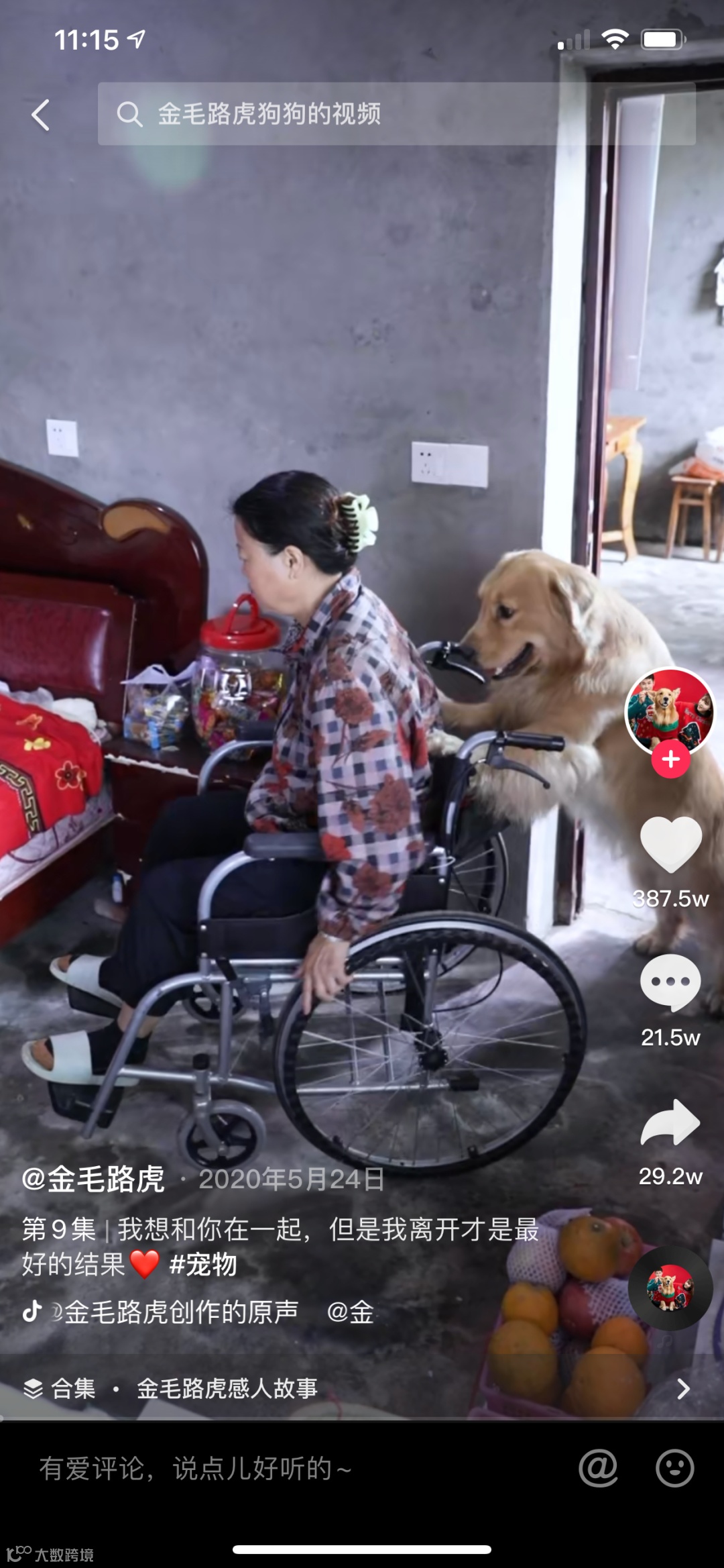 5、2021年4月28日,金毛路虎发布视频合集《金毛路虎感人故事》,目前已更新38集,播放量达到16.4亿;