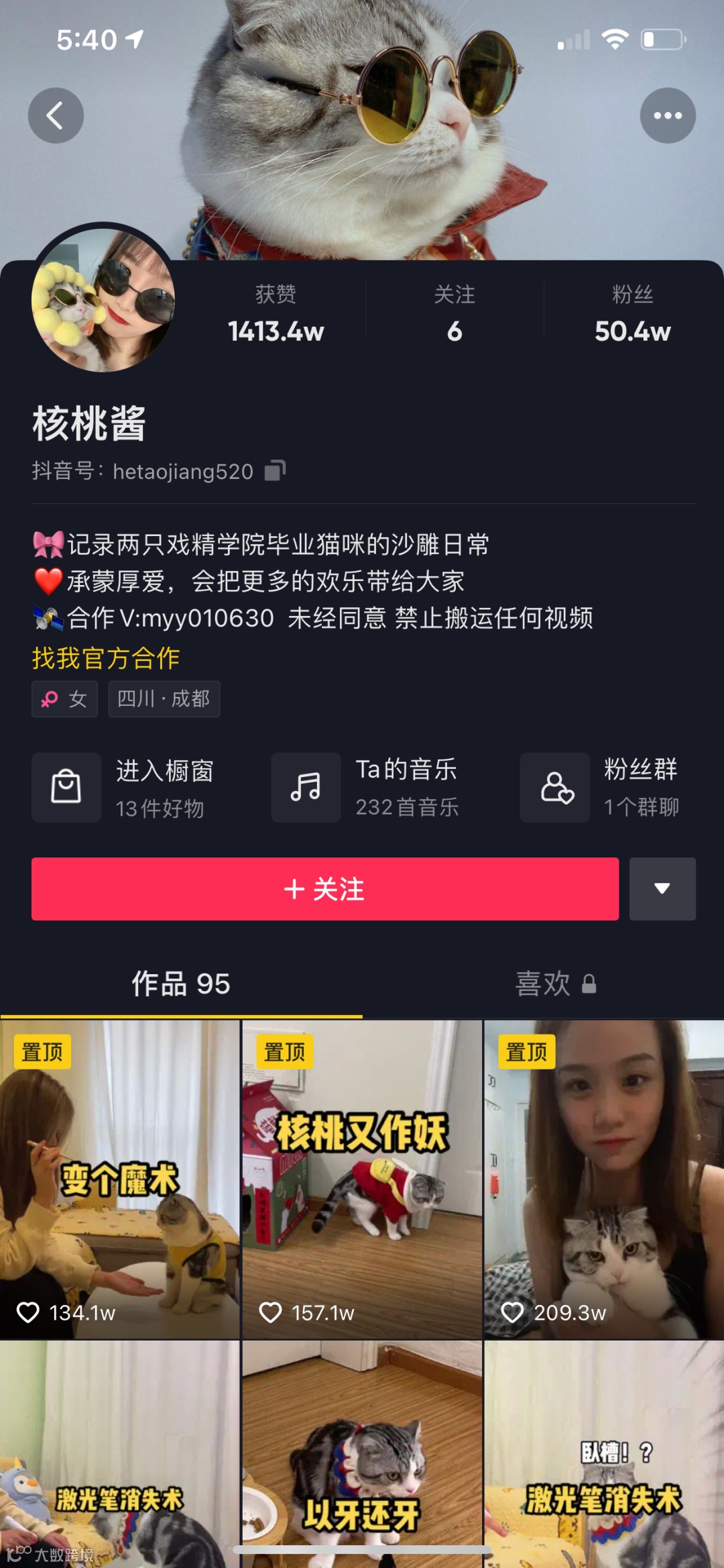 简介:核桃酱自2020年3月29日在抖音上发布了自己的第一个作品,大致内容以核桃和翠花的vlog为主,其中,获赞数最高的视频作品为《如何给你的猫咪留下心理阴影》,达到了209.3w赞。而目前核桃酱的整体获赞数更是达到了1413.4w,粉丝数达到了50.4w。
