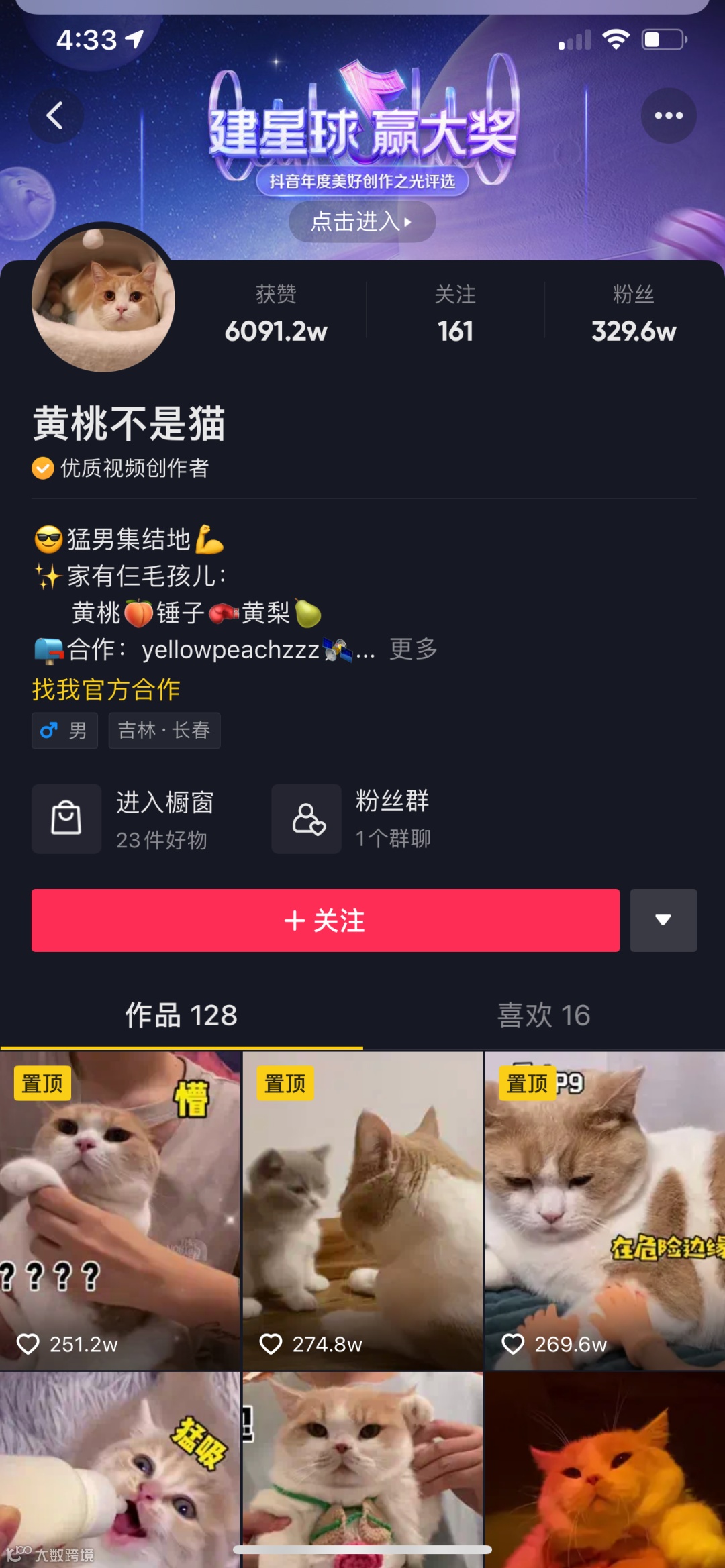 2、截至目前,黄桃不是猫共有3个点赞量超过250w的作品;