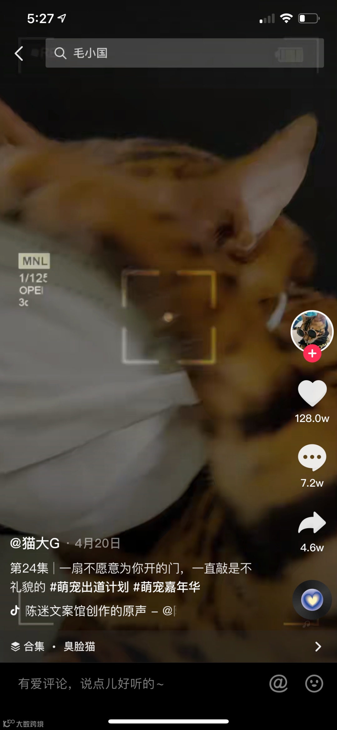 2、2021年5月28日,猫大G发布视频合集《愚蠢的铲屎官》,目前已更新17集,播放量达到了2370w;