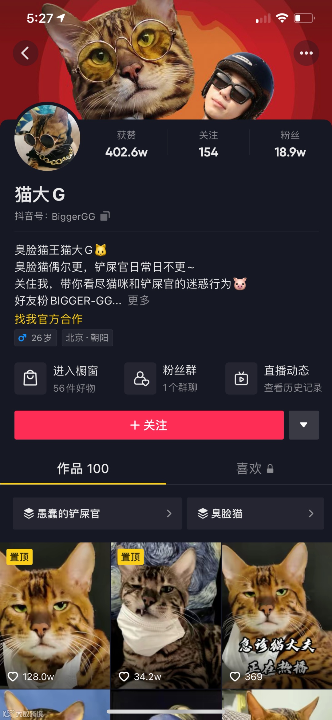 简介:猫大G自2020年7月23日在抖音上发布了自己的第一个作品,大致内容以猫大G臭脸日常vlog为主,其中,获赞数最高的视频作品为《一扇不愿意为你开的门,一直敲是不礼貌的》,达到了128.0w赞。而目猫大G的整体获赞数达到了402.6w,粉丝数达到了18.9w。