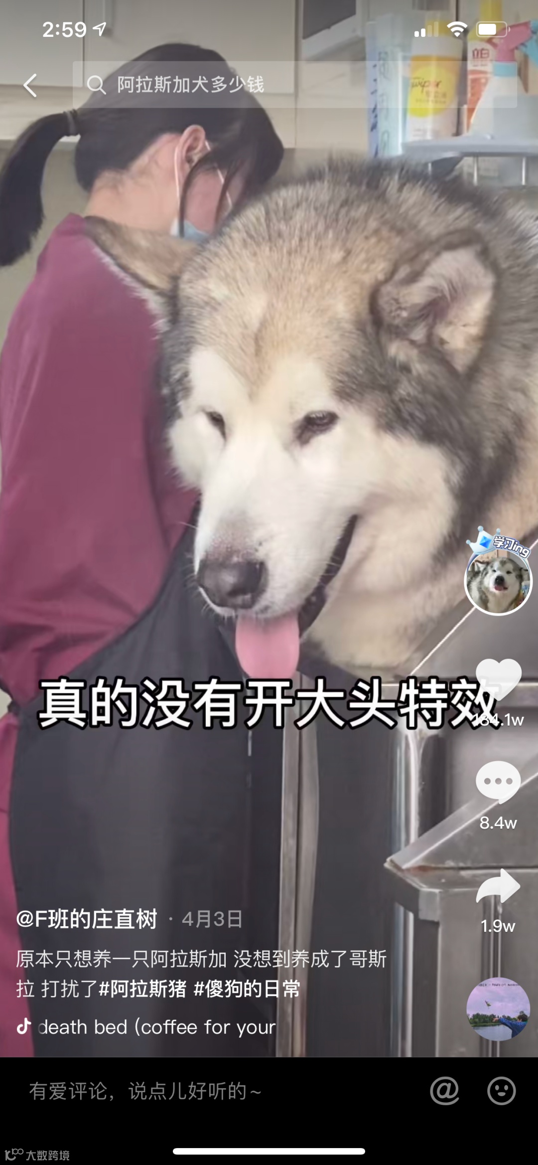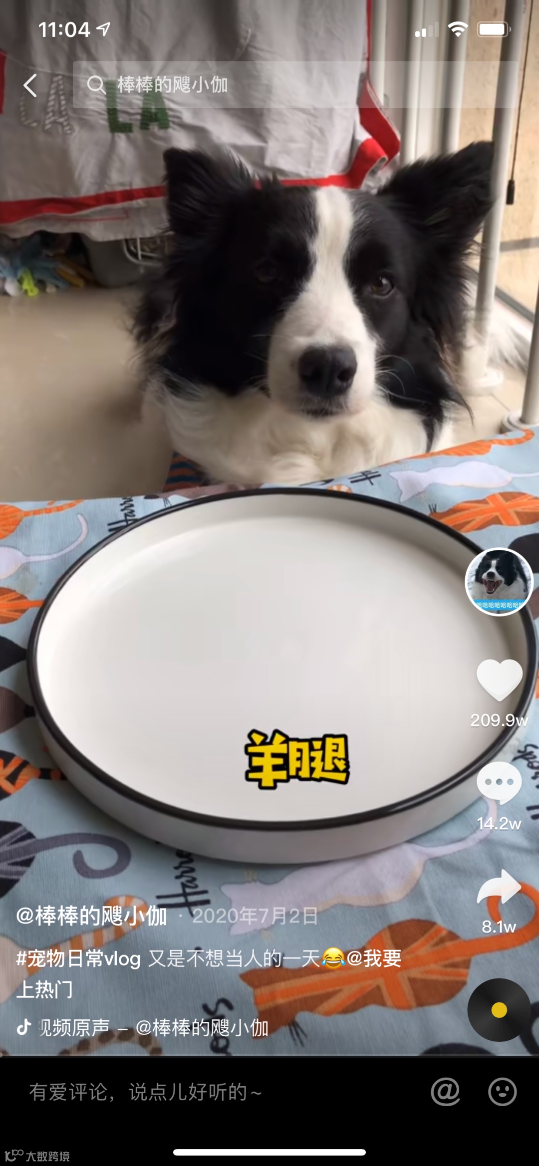 2、2020年10月8日,棒棒的飕小伽发布作品《我被我的边牧救了》,视频中作者带Soga去海边玩,当作者想玩水的时候,Soga拼命的将作者往岸上拽;
