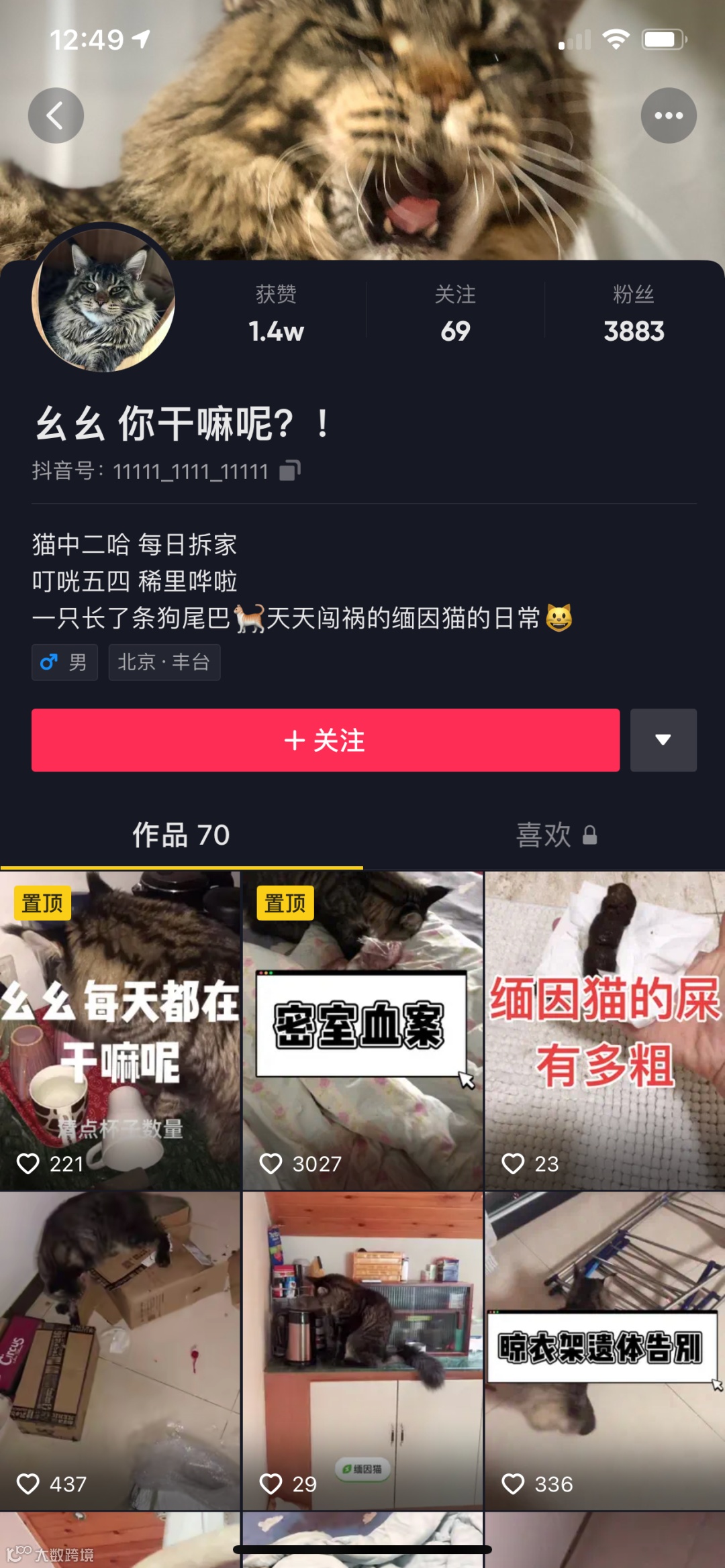 简介:幺幺 你干嘛呢?!自2020年9月12日在抖音上发布了自己的第一个作品,大致内容以缅因猫幺幺的拆家日常vlog为主,其中,获赞数最高的视频作品为《密室血案》,达到了3027赞。而目前幺幺 你干嘛呢?!的整体获赞数达到了1.4w,粉丝数达到了3887。