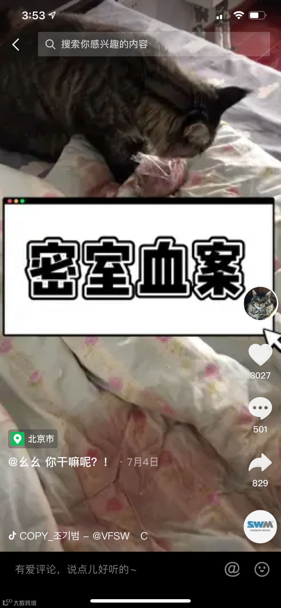 3、2021年7月18日,幺幺你干嘛呢?!发布视频《“我是幺幺”#大家一起为siri发生》,据视频中显示,幺幺是一只晕车并且怕热的猫咪,对siri的中暑可以感同身受并为siri发声;