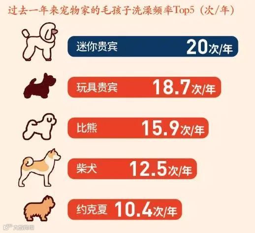 另据宠物家调查显示,迷你贵宾犬(注:迷你贵宾指肩宽小于38cm的贵宾犬)洗护的频率最高,平均一年洗澡的次数达20次,喜提洗澡频率TOP 1。