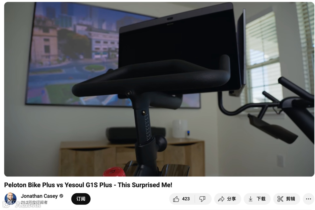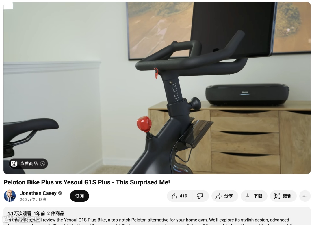 2024年,Jonathan发布了一条对比视频《Peloton Bike Plus vs Yesoul G1S Plus:哪一款更适合你?》,这条视频迅速引起了北美用户关注。截至目前,视频播放量已突破4.1万,点赞数超过419,评论区讨论热烈。