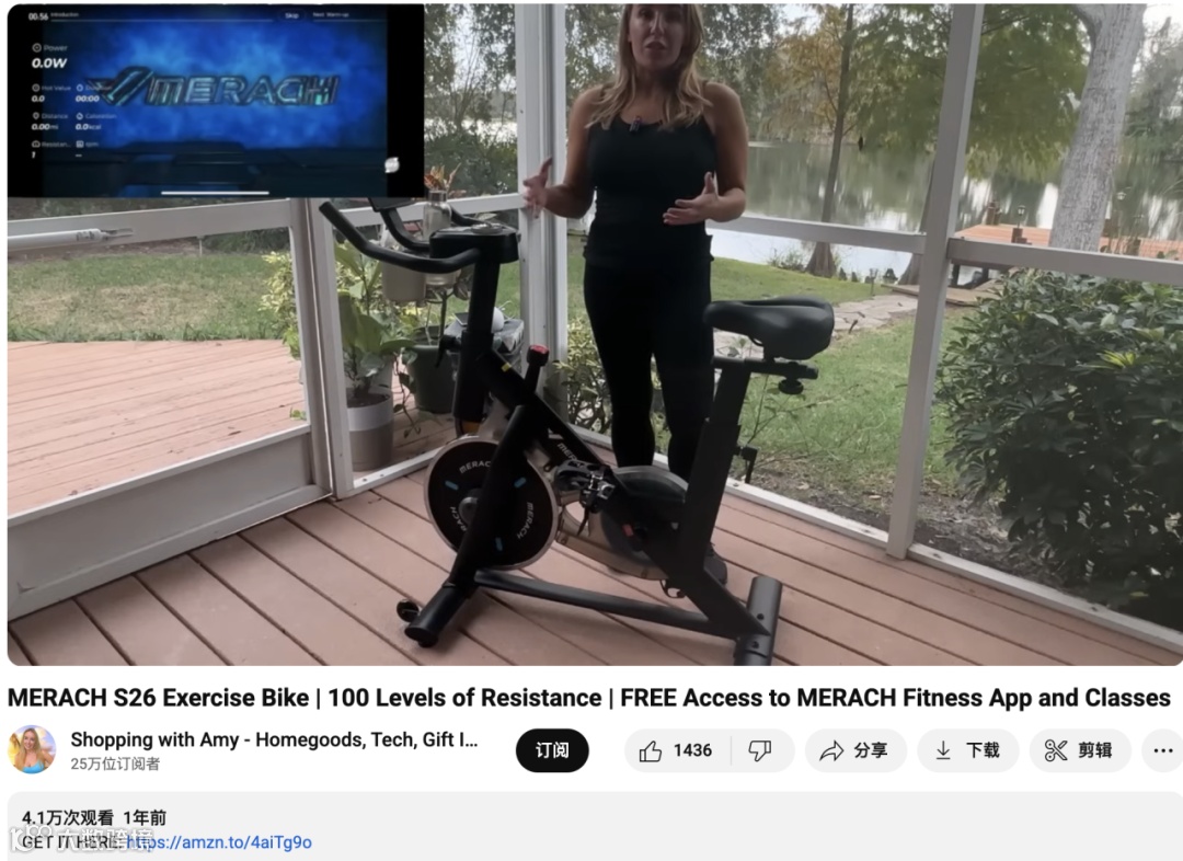 在与Merach的4个合作视频中,Amy选择评测的是MERACH S26智能力量健身车。这条视频从多个维度深入浅出地向观众展现了S26的功能亮点:例如100级阻力调节、全车无电线设计、舒适的座椅和把手调节、多角度稳定结构、大容量水壶架等细节,Amy都进行了详细展示。她不仅仅把这款产品当作一件器械在介绍,更强调其作为“家庭运动解决方案”的意义——配合Merach自研的Fitness App,用户可享受虚拟骑行、在线直播课程、数据追踪等现代智能健身体验,将健身变得既专业又充满乐趣。