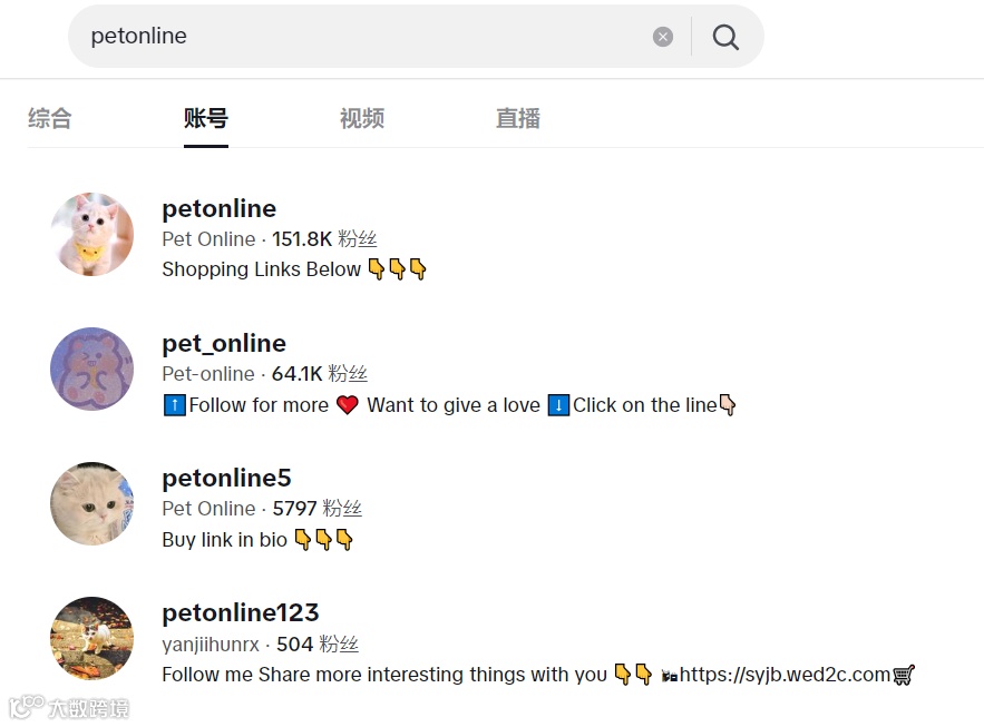 通过搜索,我们发现@petonline5是一个短视频账号矩阵,大致分为3个账号,主号@petonline拥有15万粉丝,早在3月份发布了同款产品的视频,同样超过千万播放。