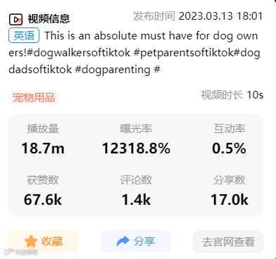 嘀嗒狗观察到,博主@petonline于3月13日在TikTok上发布的视频,获得了1870播放,6.7万的点赞量,分享数超过17k,曝光率达到了12318.8%。