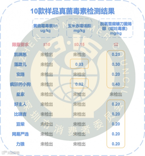 10款狗粮样品微生物标均符合标准要求,包括黄曲霉毒素B1、脱氧雪腐镰刀菌烯醇(呕吐毒素)、玉米赤霉烯酮项目均未超过《中华人民共和国农业农村部公告 第20号》附件《宠物饲料卫生规定》限值要求。其中犬粮品牌“ROYAL CANIN 皇家”真菌毒素的三个检测项目,全部未检出。