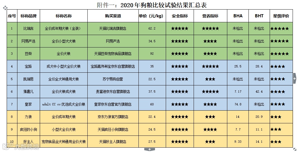 据报告显示,凯瑞思、比瑞吉、豆柴、网易严选四款狗粮样品未检出BHA与BHT。值得一提的是,比瑞吉全价成年期犬粮、网易严选全价小型犬犬粮、豆柴全价狗粮获得了此次试验的五星产品。具体试验结果如下: