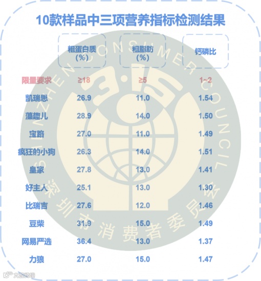 营养成分是决定犬粮等宠物食品质量的关键性指标。报告显示,10款犬粮产品的粗蛋白质、粗脂肪、水分、水溶性氯、总磷、钙检测项目全部合格,并且检测值与产品成分分析保证值一致。