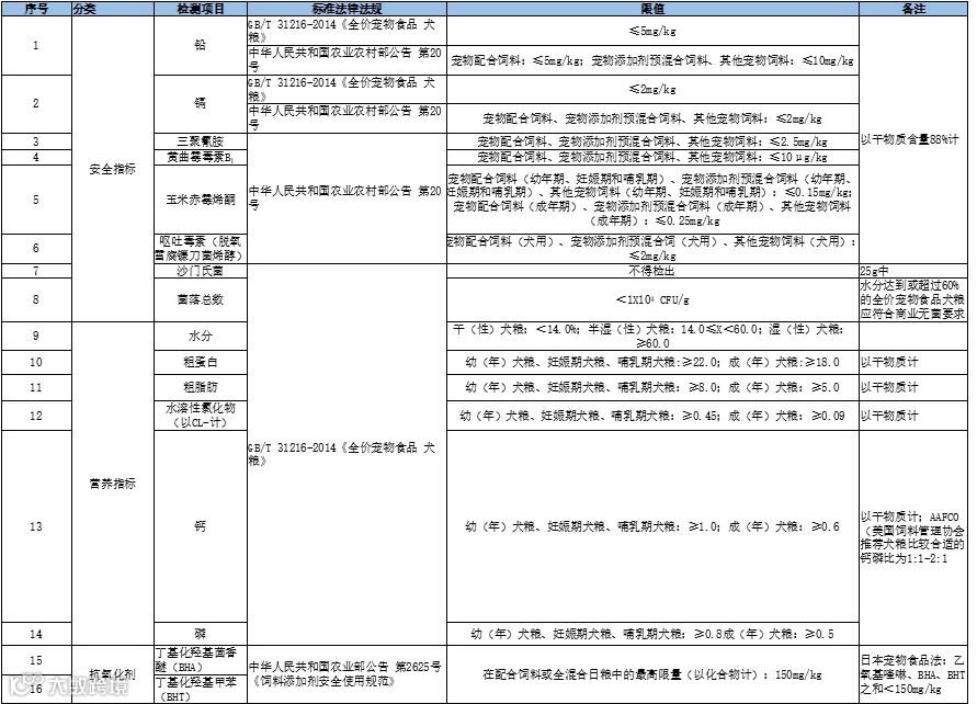 报告显示,本次比较试验依据相关的国家规范性文件以及标准要求(《宠物饲料卫生规定》、《GB/T 31216-2014 全价宠物食品 犬粮》、《饲料添加剂安全使用规范》2017年修订版)及商品明示数据等。并且采取“更多,更严”标准,多项指标参照国外的标准法规等,如钙磷比参考AAFCO(美国饲料管理协会)推荐值1:1-2:1,BHA、BHT参考日本宠物食品法:乙氧基喹啉、BHA、BHT之和<150mg/kg。