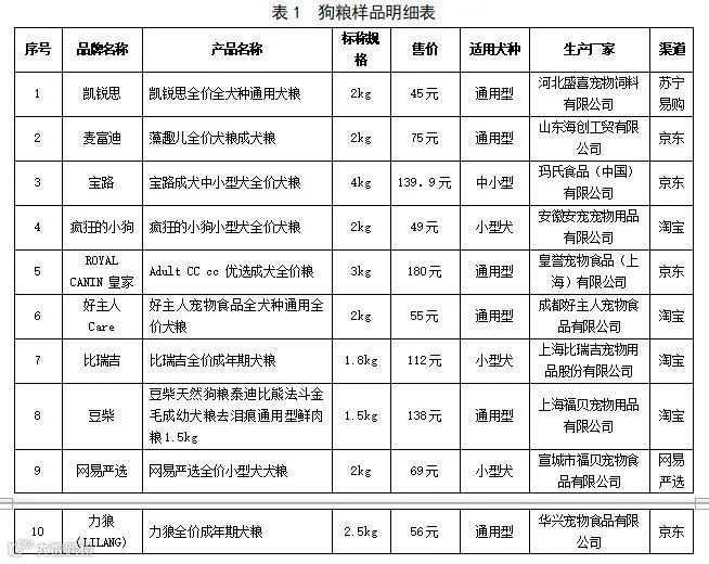 报告显示,此次产品选择主要基于产品销量以及覆盖范围等因素,从淘宝、京东、苏宁易购、网易严选等平台选购了10款热销网红狗粮。品牌涵盖了麦富迪、宝路、疯狂的小狗、皇家、好主人、比瑞吉、豆柴、网易严选、力狼、凯锐思十款狗粮,其价格从22.4元/公斤至92元/公斤不等。其样品明细表如下: