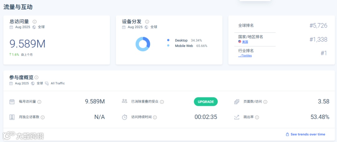 如今,VEVOR的扩张步伐仍未停止。据SimilarWeb数据,VEVOR独立站在全球纺织品类中排名第一,月访问量高达958.9万,近六成流量来自移动端,用户平均每次浏览3.58个页面、停留2分35秒,跳出率仅53.48%,展现出极强的内容粘性与用户深度互动,且受众覆盖广泛、无重叠,具备持续增长的全球影响力。