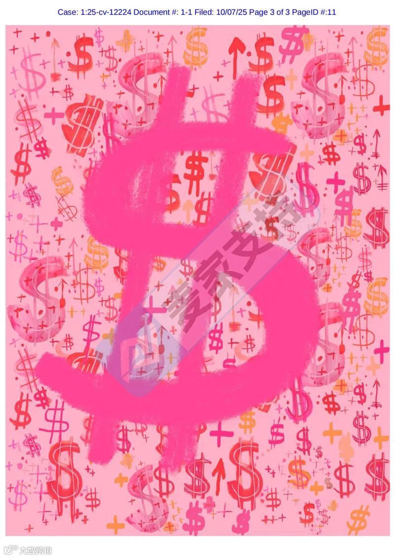 本案是keith律所代理Melanie Biehle发起的版权维权案件,涉案版权为一款版权号为:VA 2-453- 004的粉色美元符号,该图片于2025年4月15日获得美国版权认证,未经授权使用会面临TRO冻结风险,目前该案件处于前期立案阶段,暂未获批TRO临时限制令,有上架相关图片的卖家需紧急排查并下架高危产品,避免账户被TRO冻结!