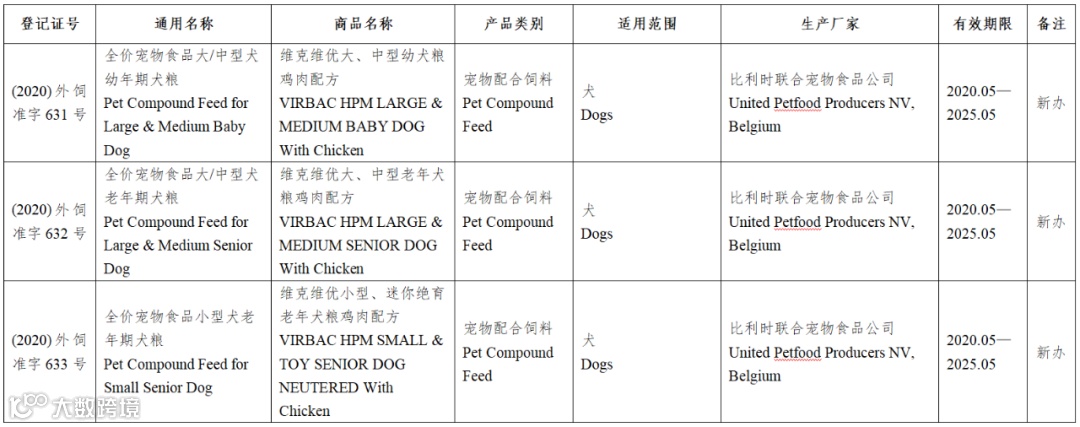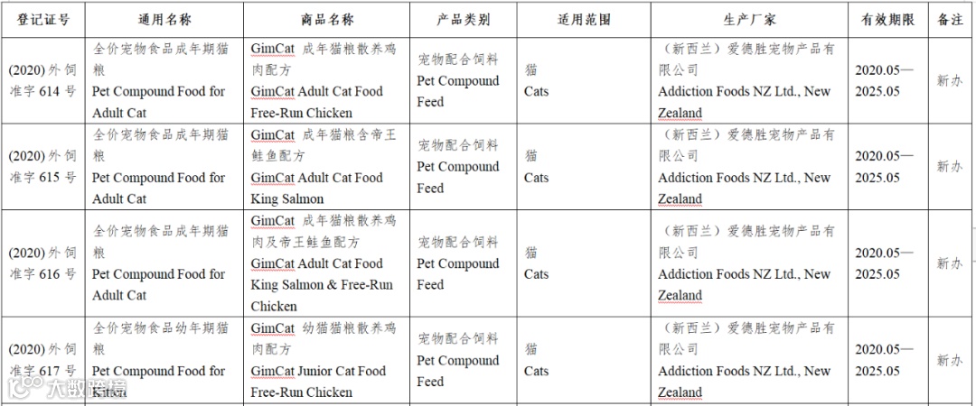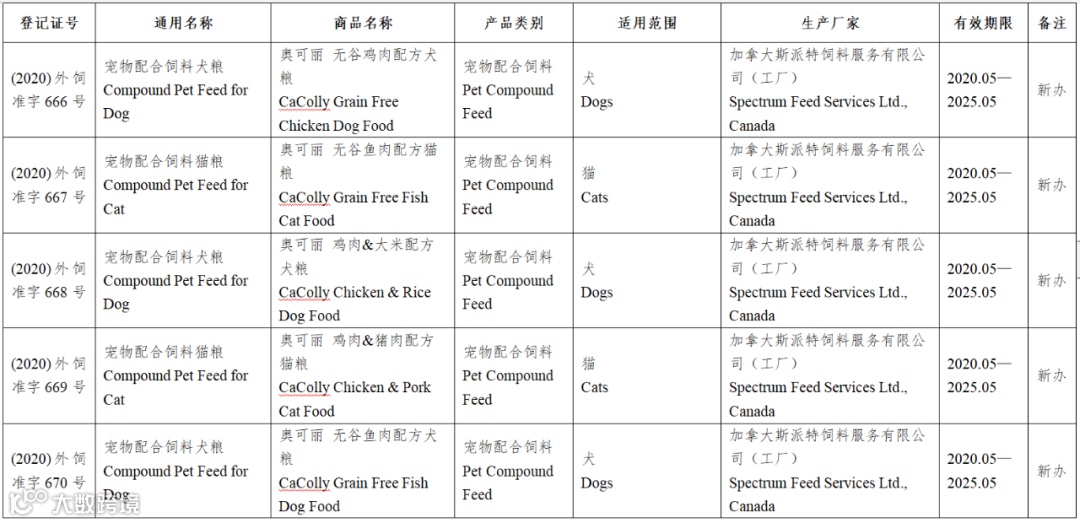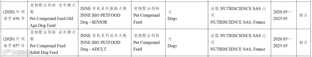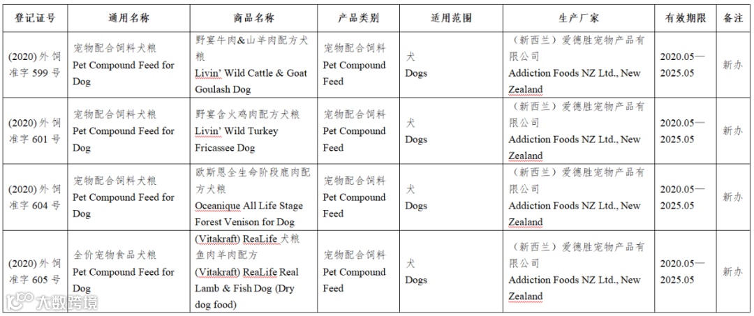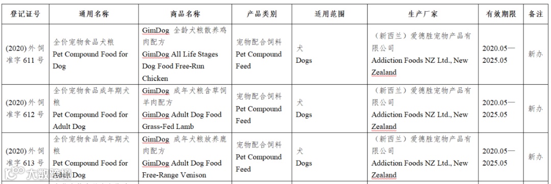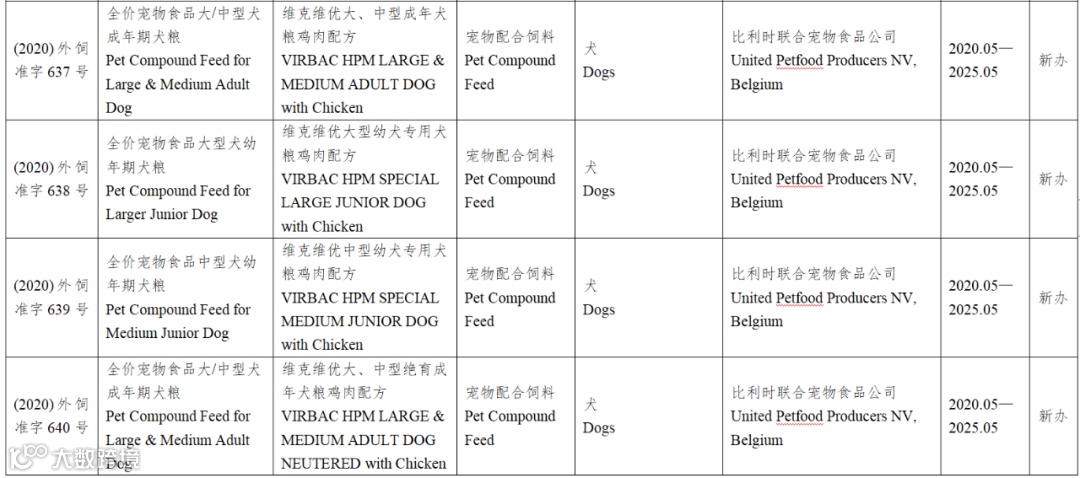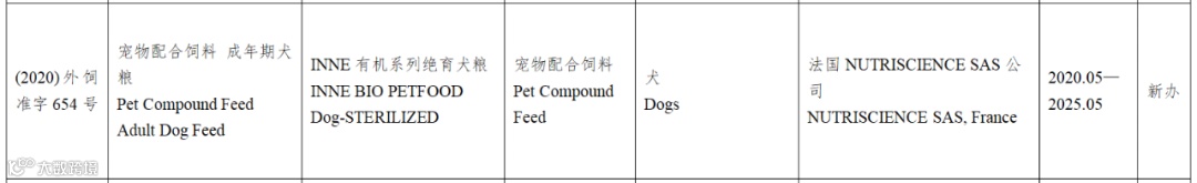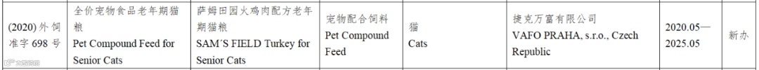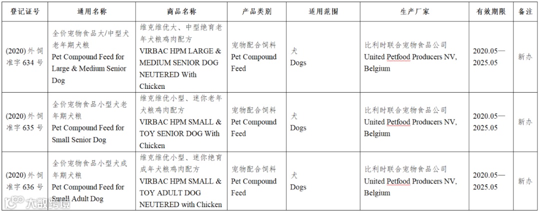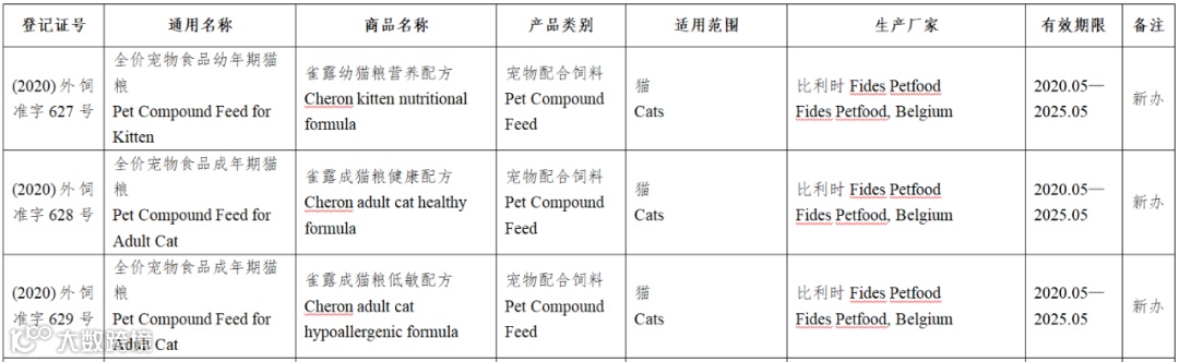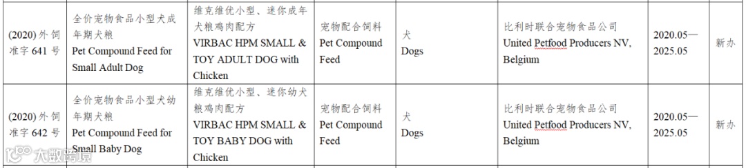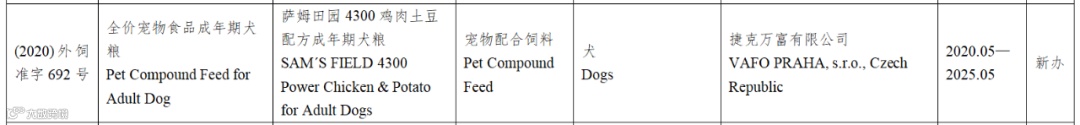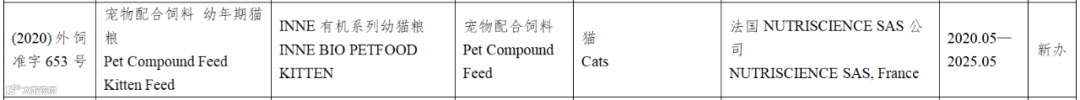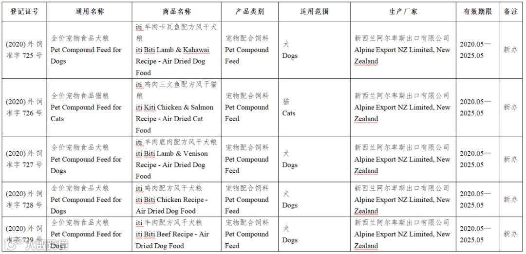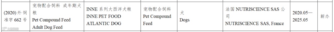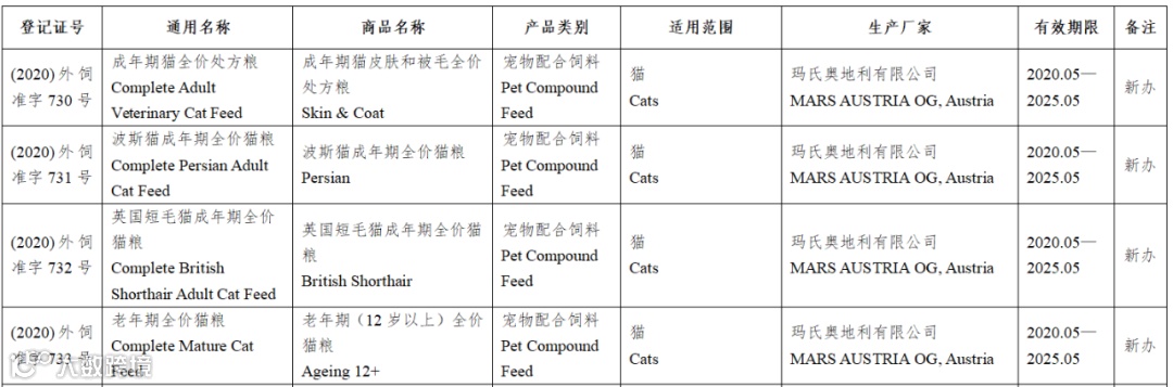 新获批登记明确用于宠物进口饲料和饲料添加剂产品(有效期2020.05—2025.05)的名单包括: