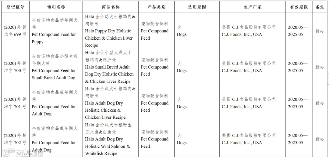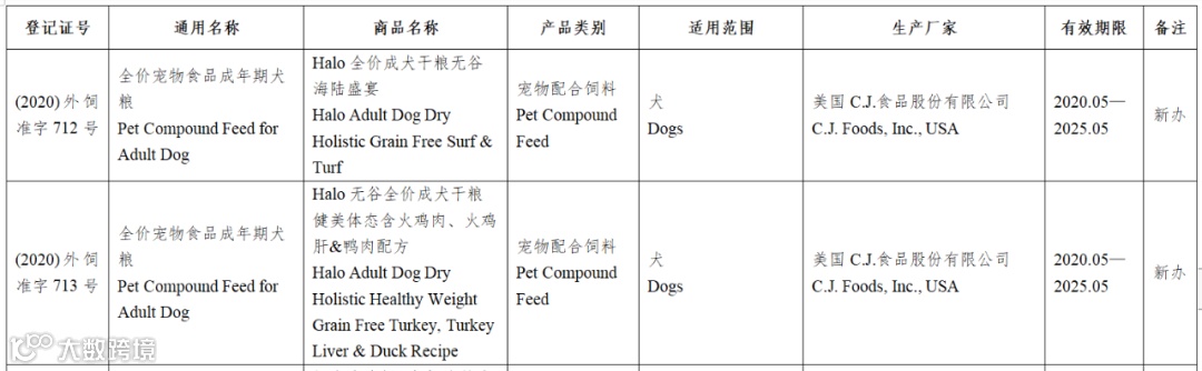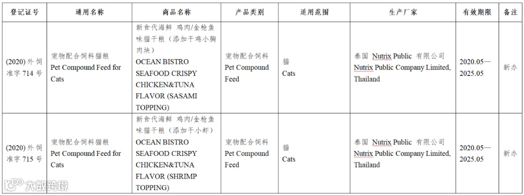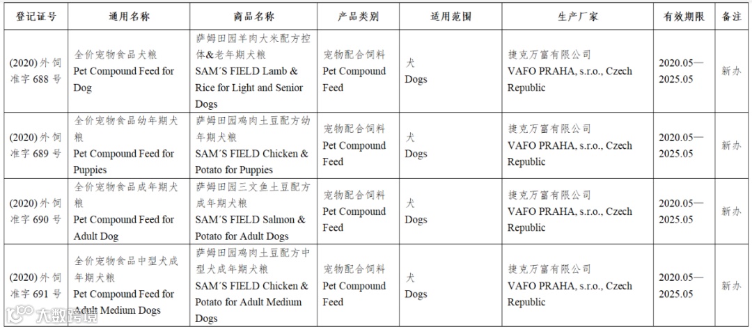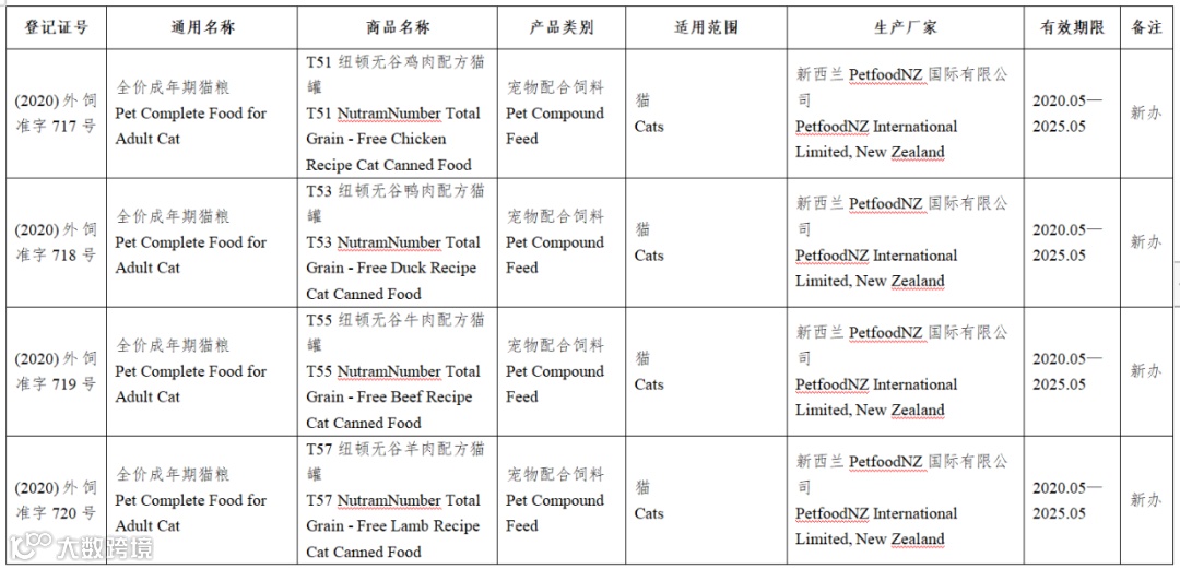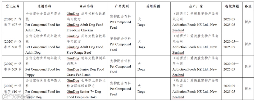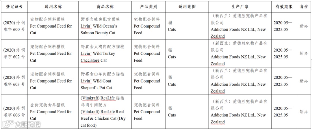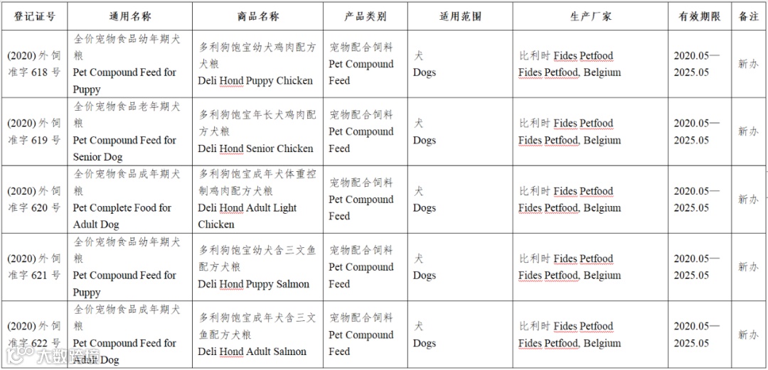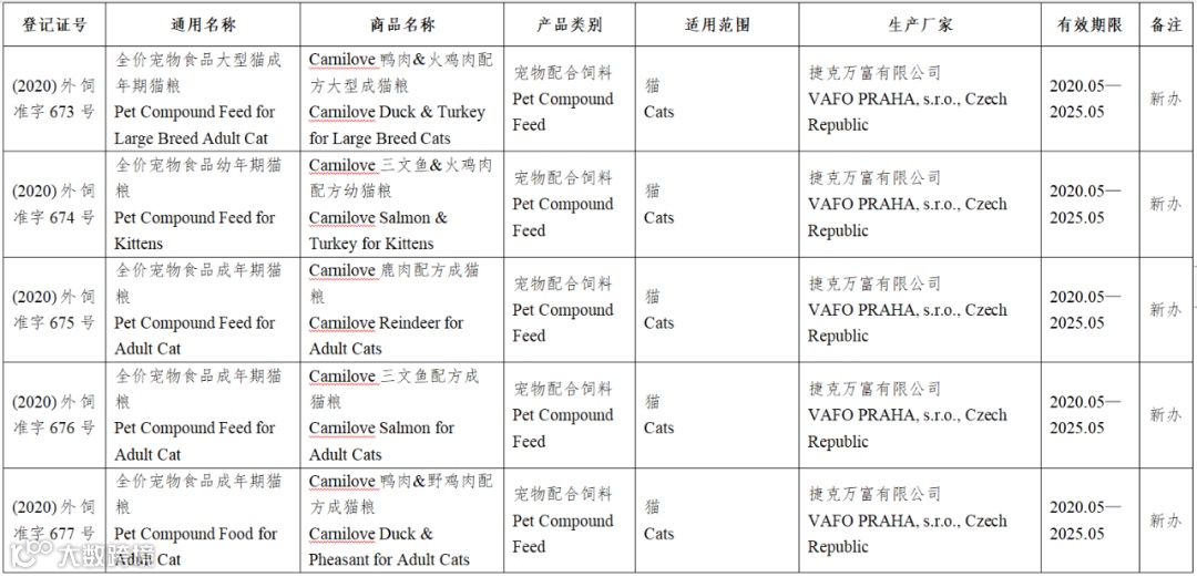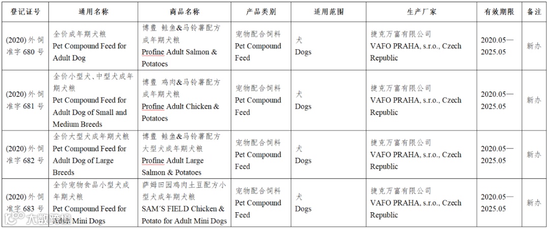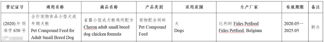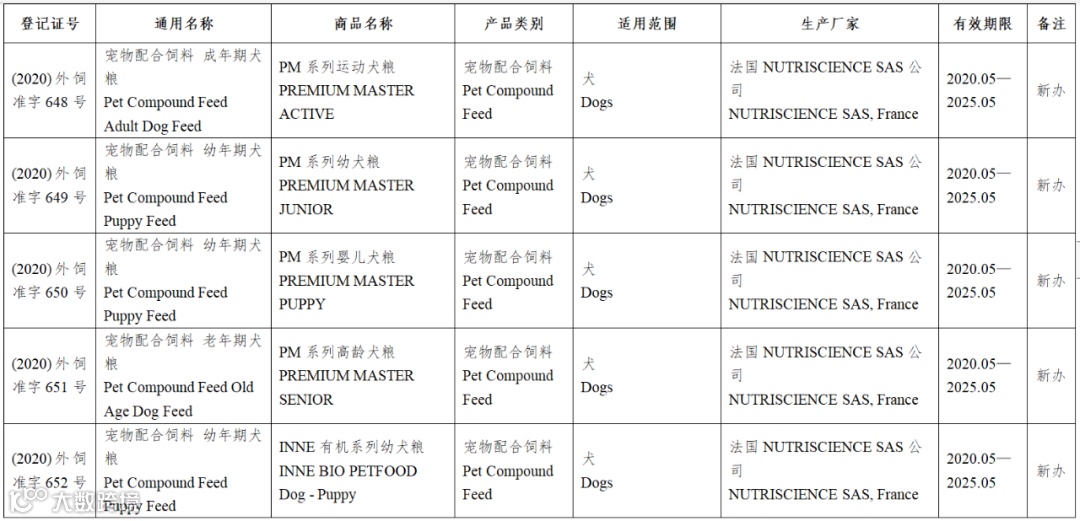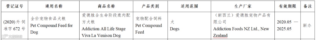新获批登记明确用于宠物进口饲料和饲料添加剂产品(有效期2020.05—2025.05)的名单包括: